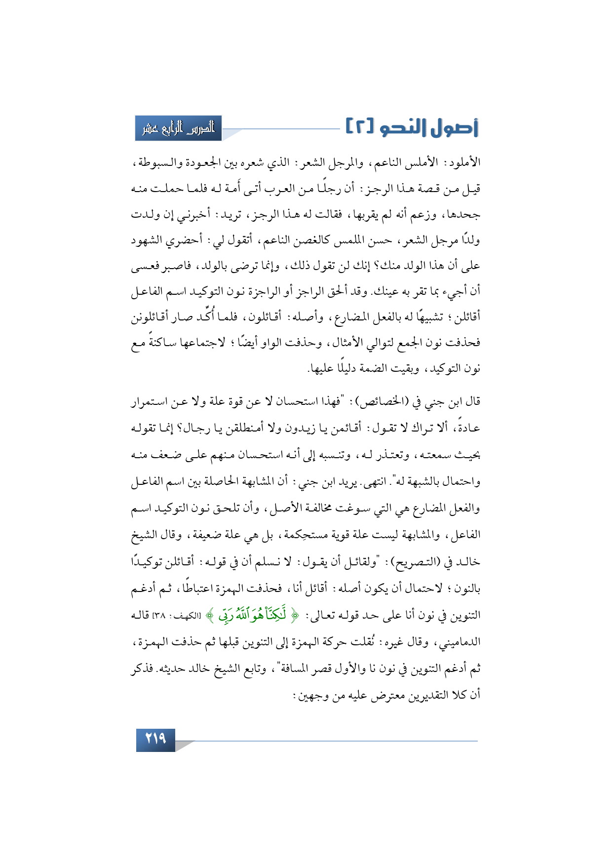 قال ابن جني في (الخصائص): "فهذا استحسان لا عن قوة علة ولا عن استمرار عادةً، ألا تراك لا تقول: أقائمن يا زيدون ولا أمنطلقن يا رجال؟ إنما تقوله بحيث سمعته، وتعتذر له، وتنسبه إلى أنه استحسان منهم على ضعف منه واحتمال بالشبهة له"، انتهى. يريد ابن جني: أن المشابهة الحاصلة بين اسم الفاعل والفعل المضارع هي التي سوغت مخالفة الأصل، وأن تلحق نون التوكيد اسم الفاعل، والمشابهة ليست علة قوية مستحِكمة، بل هي علة ضعيفة، وقال الشيخ خالد في (التصريح): "ولقائل أن يقول: لا نسلم أن في قوله: أقائلن توكيدًا بالنون؛ لاحتمال أن يكون أصله: أقائل أنا، فحذفت الهمزة اعتباطًا، ثم أدغم التنوين في نون أنا على حد قوله تعالى: {لَكِنَّا هُوَ اللَّهُ رَبِّي} (الكهف: 38) قاله الدماميني، وقال غيره: نُقلت حركة الهمزة إلى التنوين قبلها ثم حذفت الهمزة، ثم أدغم التنوين في نون نا والأول قصر المسافة"، وتابع الشيخ خالد حديثه. فذكر أن كلا التقديرين معترض عليه من وجهين: