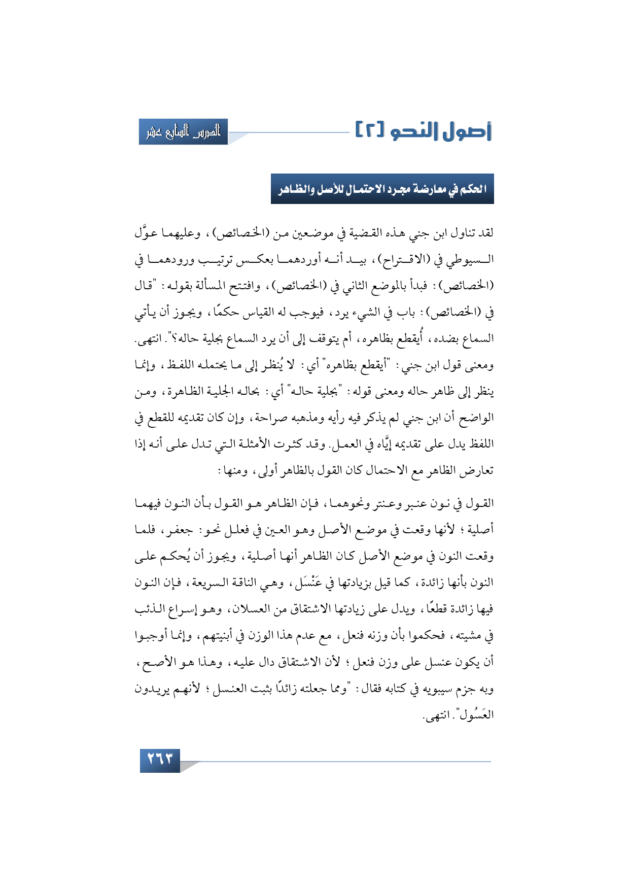 لقد تناول ابن جني هذه القضية في موضعين من (الخصائص)، وعليهما عوَّل السيوطي في (الاقتراح)، بيد أنه أوردهما بعكس ترتيب ورودهما في (الخصائص): فبدأ بالموضع الثاني في (الخصائص)، وافتتح المسألة بقوله: "قال في (الخصائص): باب في الشيء يرد، فيوجب له القياس حكمًا، ويجوز أن يأتي السماع بضده، أُيقطع بظاهره، أم يتوقف إلى أن يرد السماع بجلية حاله؟ " انتهى. ومعنى قول ابن جني: "أيقطع بظاهره" أي: لا يُنظر إلى ما يحتمله اللفظ، وإنما ينظر إلى ظاهر حاله ومعنى قوله: "بجلية حاله" أي: بحاله الجلية الظاهرة، ومن الواضح أن ابن جني لم يذكر فيه رأيه ومذهبه صراحة، وإن كان تقديمه للقطع في اللفظ يدل على تقديمه إيَّاه في العمل. وقد كثرت الأمثلة التي تدل على أنه إذا تعارض الظاهر مع الاحتمال كان القول بالظاهر أولى، ومنها: