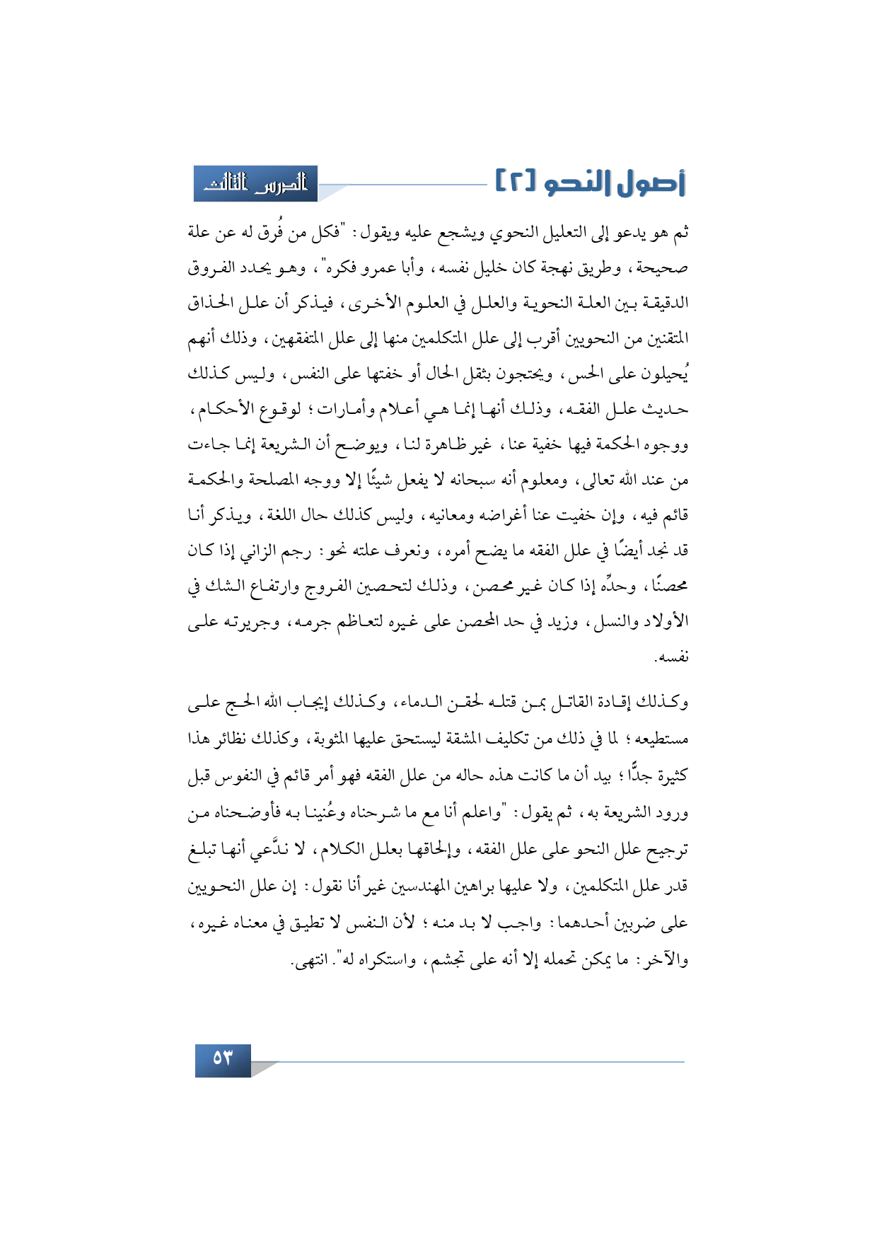 وكذلك إقادة القاتل بمن قتله لحقن الدماء، وكذلك إيجاب الله الحج على مستطيعه؛ لما في ذلك من تكليف المشقة ليستحق عليها المثوبة، وكذلك نظائر هذا كثيرة جدًّا؛ بيد أن ما كانت هذه حاله من علل الفقه فهو أمر قائم في النفوس قبل ورود الشريعة به، ثم يقول: "واعلم أنا مع ما شرحناه وعُنينا به فأوضحناه من ترجيح علل النحو على علل الفقه، وإلحاقها بعلل الكلام، لا ندَّعي أنها تبلغ قدر علل المتكلمين، ولا عليها براهين المهندسين غير أنا نقول: إن علل النحويين على ضربين أحدهما: واجب لا بد منه، لأن النفس لا تطيق في معناه غيره، والآخر: ما يمكن تحمله إلا أنه على تجشم، واستكراه له"، انتهى.