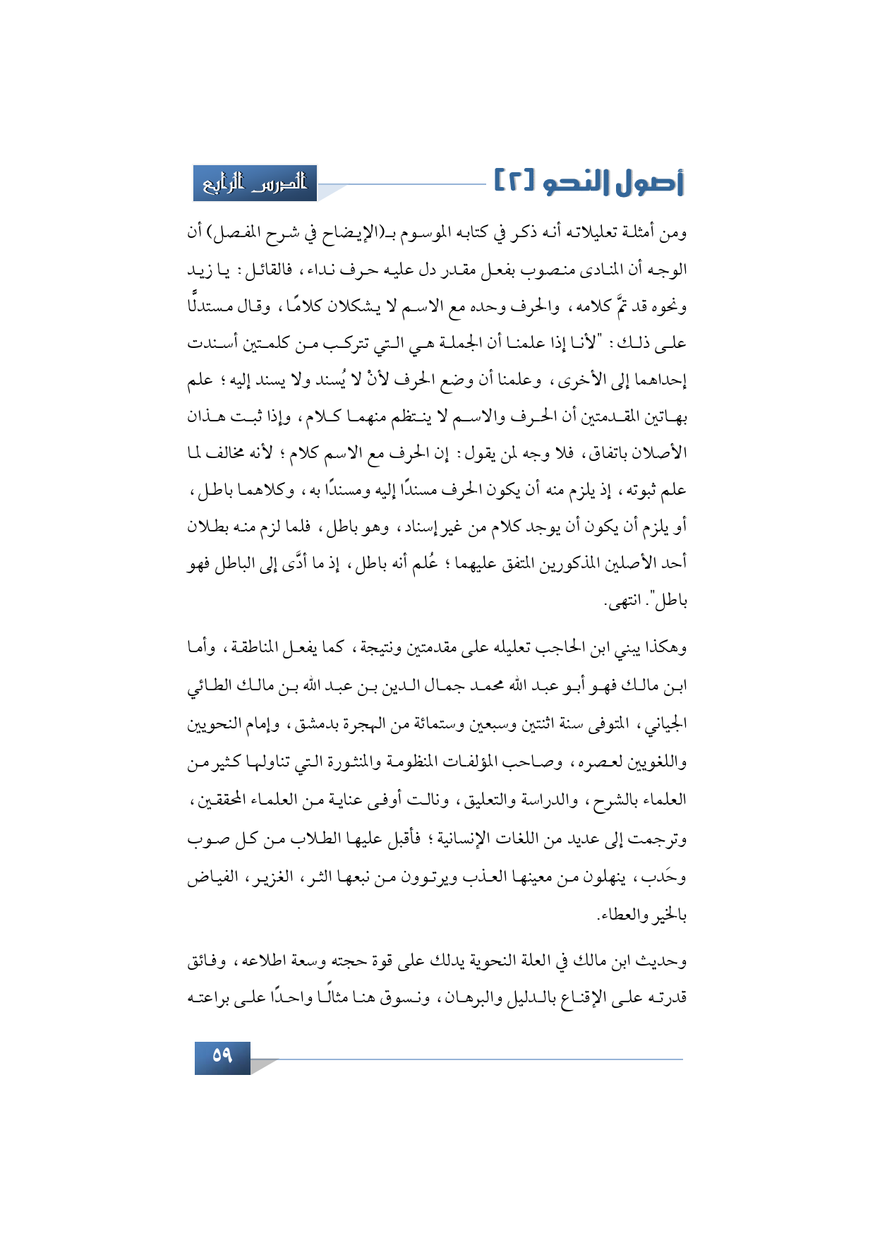 وهكذا يبني ابن الحاجب تعليله على مقدمتين ونتيجة، كما يفعل المناطقة، وأما ابن مالك فهو أبو عبد الله محمد جمال الدين بن عبد الله بن مالك الطائي الجياني، المتوفى سنة اثنتين وسبعين وستمائة من الهجرة بدمشق، وإمام النحويين واللغويين لعصره، وصاحب المؤلفات المنظومة والمنثورة التي تناولها كثير من العلماء بالشرح، والدراسة والتعليق، ونالت أوفى عناية من العلماء المحققين، وترجمت إلى عديد من اللغات الإنسانية؛ فأقبل عليها الطلاب من كل صوب وحَدب، ينهلون من معينها العذب ويرتوون من نبعها الثر، الغزير، الفياض بالخير والعطاء.