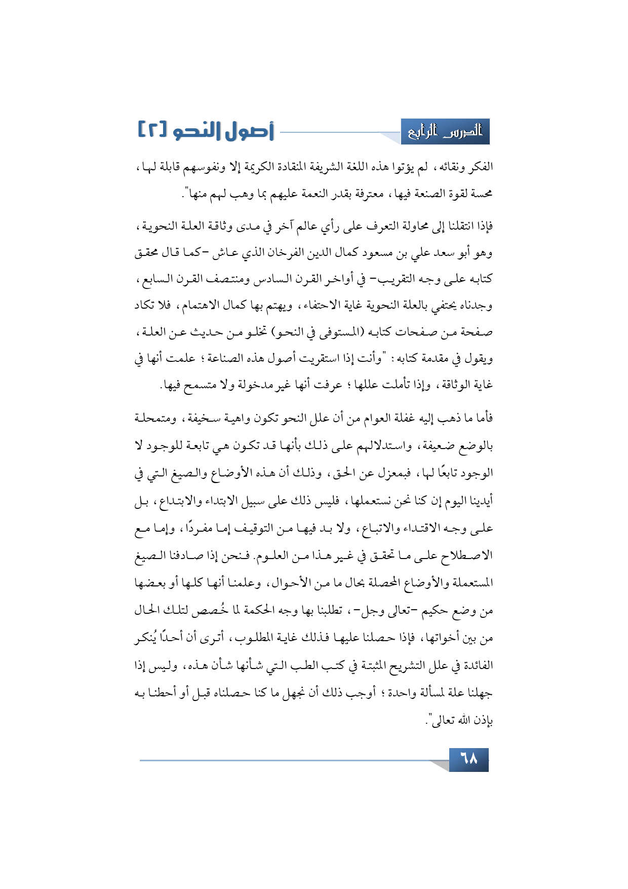 فإذا انتقلنا إلى محاولة التعرف على رأي عالم آخر في مدى وثاقة العلة النحوية، وهو أبو سعد علي بن مسعود كمال الدين الفرخان الذي عاش -كما قال محقق كتابه على وجه التقريب- في أواخر القرن السادس ومنتصف القرن السابع، وجدناه يحتفي بالعلة النحوية غاية الاحتفاء، ويهتم بها كمال الاهتمام، فلا تكاد صفحة من صفحات كتابه (المستوفى في النحو) تخلو من حديث عن العلة، ويقول في مقدمة كتابه: "وأنت إذا استقريت أصول هذه الصناعة؛ علمت أنها في غاية الوثاقة، وإذا تأملت عللها؛ عرفت أنها غير مدخولة ولا متسمح فيها.