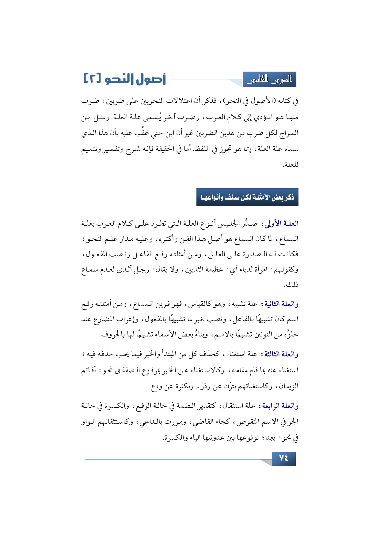 والعلة الثانية: علة تشبيه، وهو كالقياس، فهو قرين السماع، ومن أمثلته رفع اسم كان تشبيهًا بالفاعل، ونصب خبر ما تشبيهًا بالمفعول، وإعراب المضارع عند خلوِّه من النونين تشبيهًا بالاسم، وبناءُ بعض الأسماء تشبيهًا لها بالحروف.