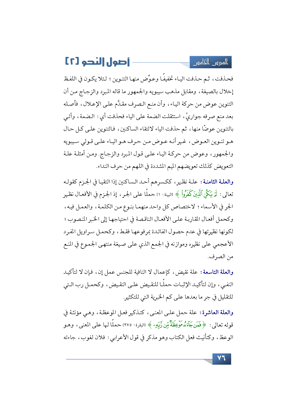 والعلة الثامنة: علة نظير، ككسرهم أحد الساكنين إذا التقيا في الجزم كقوله تعالى: {لَمْ يَكُنِ الَّذِينَ كَفَرُوا} (البينة: 1) حملًا على الجر، إذ الجزم في الأفعال نظير الجر في الأسماء؛ لاختصاص كل واحد منهما بنوع من الكلمة، والعمل فيه، وكحمل أفعال المقاربة على الأفعال الناقصة في احتياجها إلى الخبر المنصوب؛ لكونها نظيرتها في عدم حصول الفائدة بمرفوعها فقط، وكحمل سراويل المفرد الأعجمي على نظيره وموازنه في الجمع الذي على صيغة منتهى الجموع في المنع من الصرف.