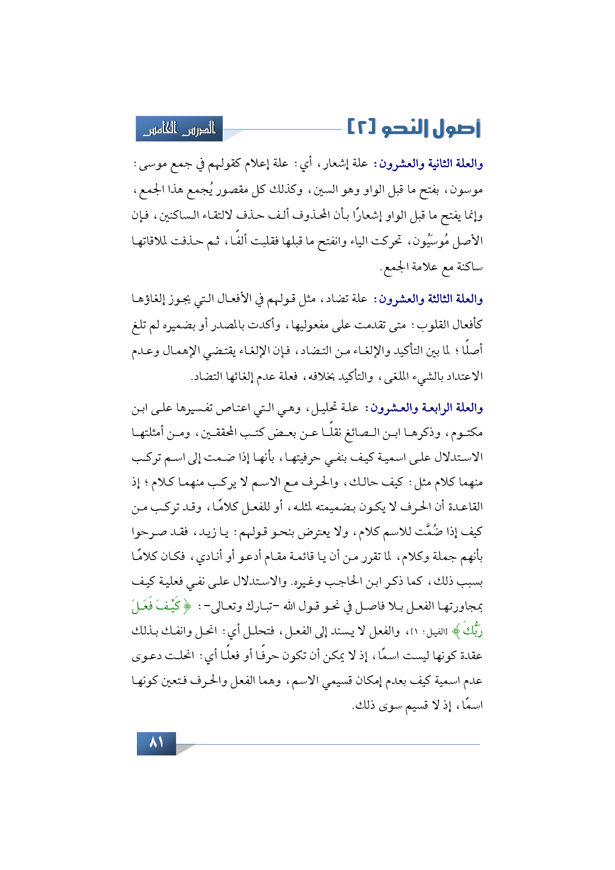 والعلة الثانية والعشرون: علة إشعار، أي: علة إعلام كقولهم في جمع موسى: موسون، بفتح ما قبل الواو وهو السين، وكذلك كل مقصور يُجمع هذا الجمع، وإنما يفتح ما قبل الواو إشعارًا بأن المحذوف ألف حذف لالتقاء الساكنين، فإن الأصل مُوسَيُون، تحركت الياء وانفتح ما قبلها فقلبت ألفًا، ثم حذفت لملاقاتها ساكنة مع علامة الجمع. والعلة الثالثة والعشرون: علة تضاد، مثل قولهم في الأفعال التي يجوز إلغاؤها كأفعال القلوب: متى تقدمت على مفعوليها، وأكدت بالمصدر أو بضميره لم تلغ أصلًا؛ لما بين التأكيد والإلغاء من التضاد، فإن الإلغاء يقتضي الإهمال وعدم الاعتداد بالشيء الملغى، والتأكيد بخلافه، فعلة عدم إلغائها التضاد.