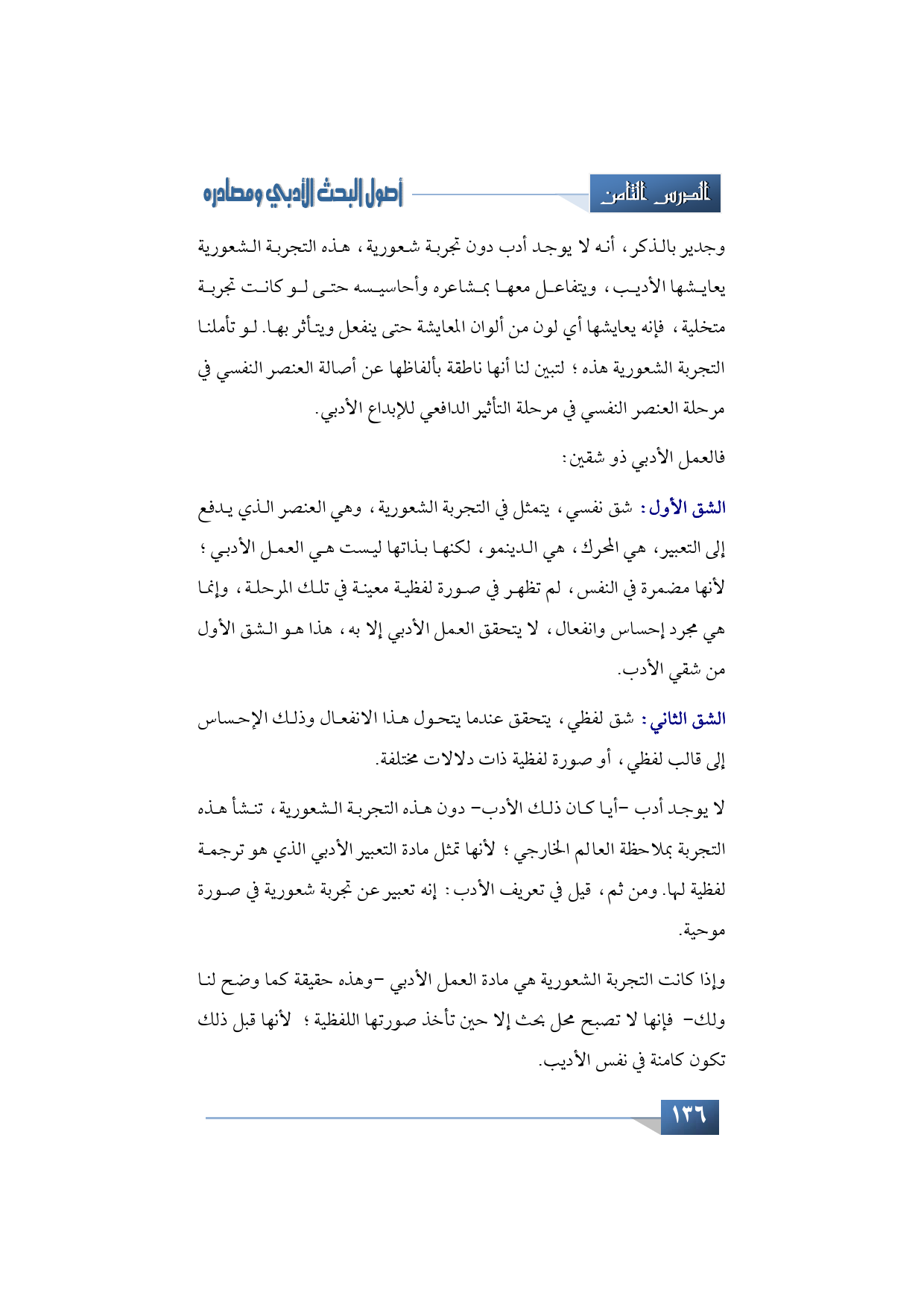 وإذا كانت التجربة الشعورية هي مادة العمل الأدبي -وهذه حقيقة كما وضح لنا ولك- فإنها لا تصبح محل بحث إلا حين تأخذ صورتها اللفظية؛ لأنها قبل ذلك تكون كامنة في نفس الأديب.