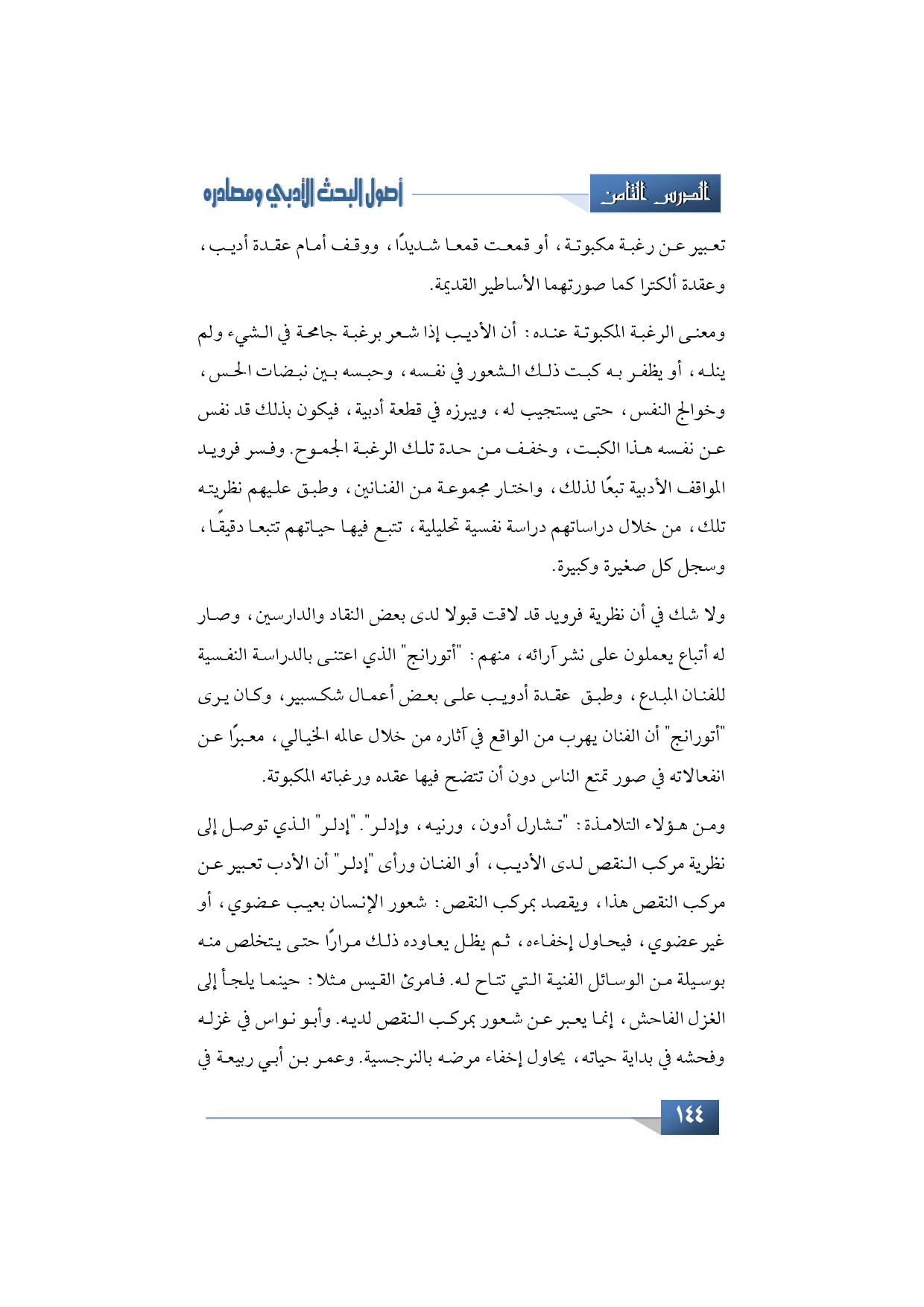 ومن هؤلاء التلامذة: "تشارل أدون، ورنيه، وإدلر". "إدلر" الذي توصل إلى نظرية مركب النقص لدى الأديب، أو الفنان ورأى إدلر أن الأدب تعبير عن مركب النقص هذا، ويقصد بمركب النقص: شعور الإنسان بعيب عضوي، أو غير عضوي، فيحاول إخفاءه، ثم يظل يعاوده ذلك مرارًا حتى يتخلص منه بوسيلة من الوسائل الفنية التي تتاح له. فامرئ القيس مثلا: حينما يلجأ إلى الغزل الفاحش، إنما يعبر عن شعور بمركب النقص لديه. وأبو نواس في غزله وفحشه في بداية حياته، يحاول إخفاء مرضه بالنرجسية. وعمر بن أبي ربيعة في