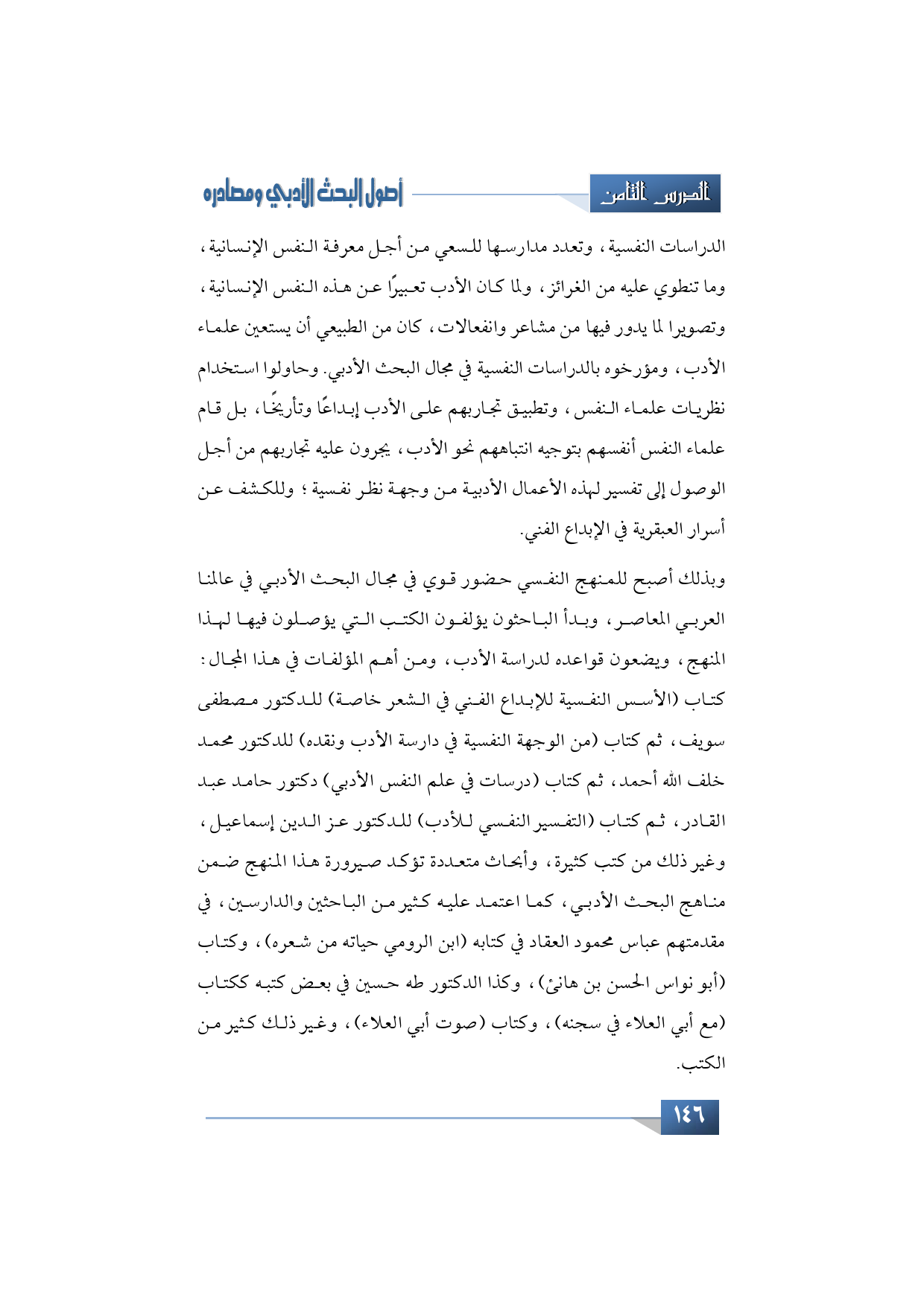 وبذلك أصبح للمنهج النفسي حضور قوي في مجال البحث الأدبي في عالمنا العربي المعاصر، وبدأ الباحثون يؤلفون الكتب التي يؤصلون فيها لهذا المنهج، ويضعون قواعده لدراسة الأدب، ومن أهم المؤلفات في هذا المجال: كتاب (الأسس النفسية للإبداع الفني في الشعر خاصة) للدكتور مصطفى سويف، ثم كتاب (من الوجهة النفسية في دارسة الأدب ونقده) للدكتور محمد خلف الله أحمد، ثم كتاب (درسات في علم النفس الأدبي) دكتور حامد عبد القادر، ثم كتاب (التفسير النفسي للأدب) للدكتور عز الدين إسماعيل، وغير ذلك من كتب كثيرة، وأبحاث متعددة تؤكد صيرورة هذا المنهج ضمن مناهج البحث الأدبي، كما اعتمد عليه كثير من الباحثين والدارسين، في مقدمتهم عباس محمود العقاد في كتابه (ابن الرومي حياته من شعره)، وكتاب (أبو نواس الحسن بن هانئ)، وكذا الدكتور طه حسين في بعض كتبه ككتاب (مع أبي العلاء في سجنه)، وكتاب (صوت أبي العلاء)، وغير ذلك كثير من الكتب.