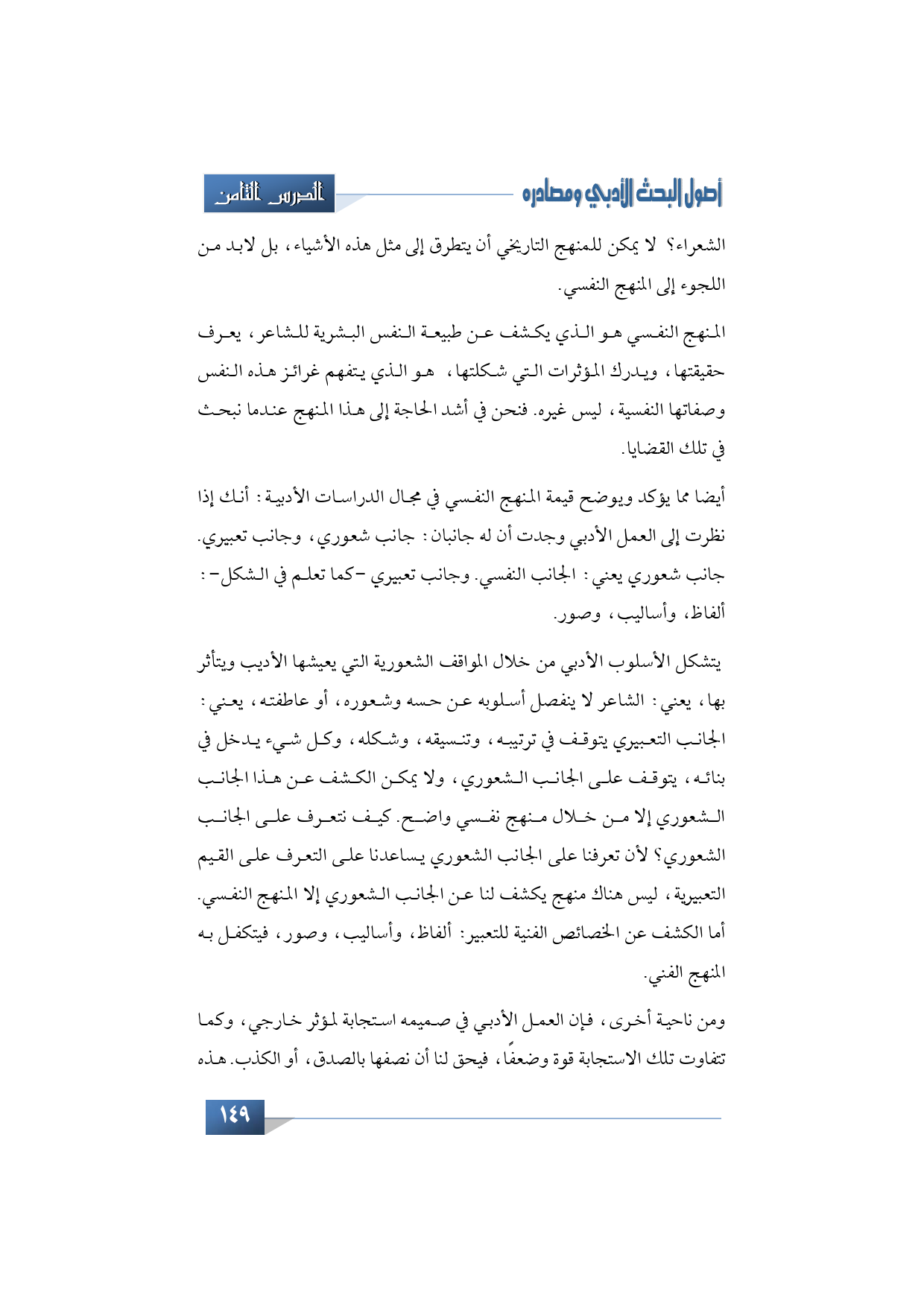 المنهج النفسي هو الذي يكشف عن طبيعة النفس البشرية للشاعر، يعرف حقيقتها، ويدرك المؤثرات التي شكلتها، هو الذي يتفهم غرائز هذه النفس وصفاتها النفسية، ليس غيره. فنحن في أشد الحاجة إلى هذا المنهج عندما نبحث في تلك القضايا.