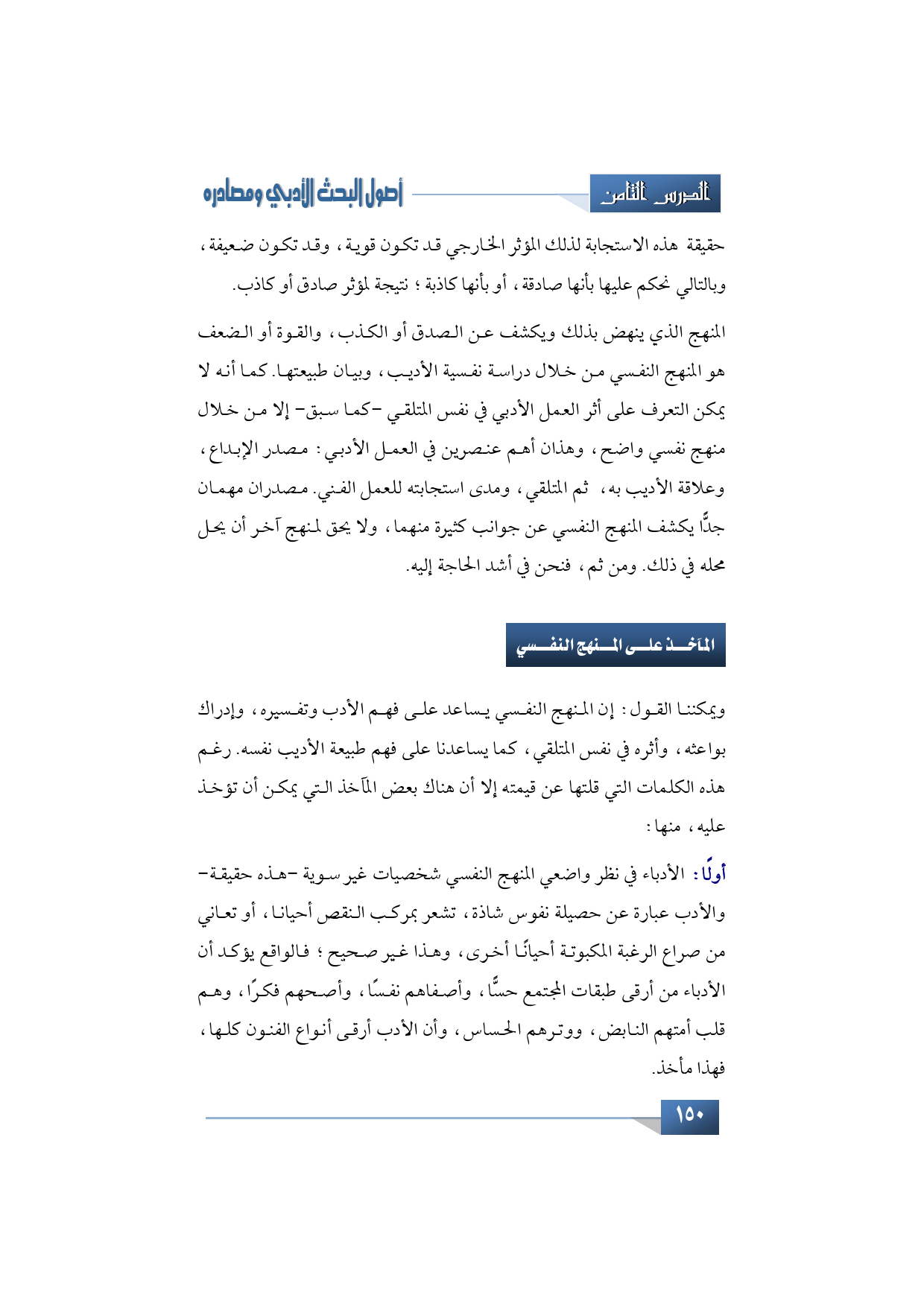 المنهج الذي ينهض بذلك ويكشف عن الصدق أو الكذب، والقوة أو الضعف هو المنهج النفسي من خلال دراسة نفسية الأديب، وبيان طبيعتها. كما أنه لا يمكن التعرف على أثر العمل الأدبي في نفس المتلقي -كما سبق- إلا من خلال منهج نفسي واضح، وهذان أهم عنصرين في العمل الأدبي: مصدر الإبداع، وعلاقة الأديب به، ثم المتلقي، ومدى استجابته للعمل الفني. مصدران مهمان جدًّا يكشف المنهج النفسي عن جوانب كثيرة منهما، ولا يحق لمنهج آخر أن يحل محله في ذلك. ومن ثم، فنحن في أشد الحاجة إليه.