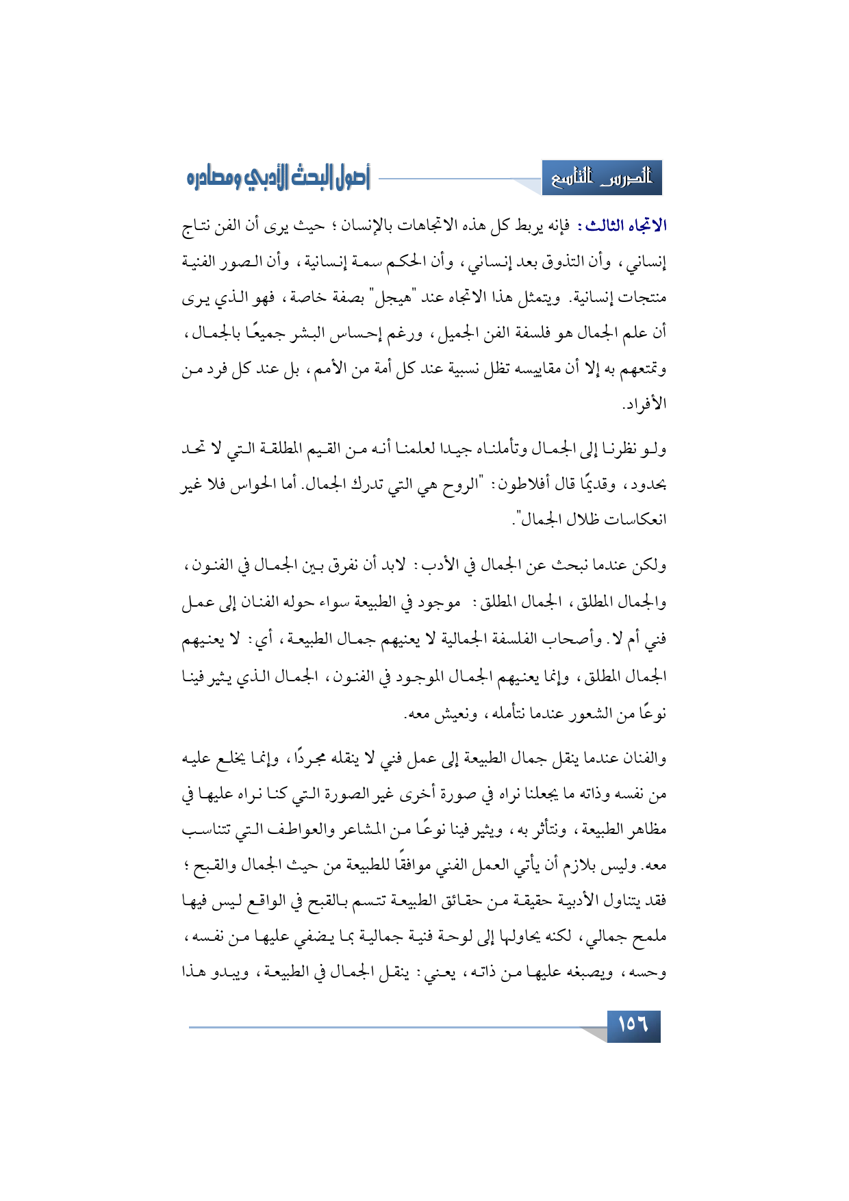 أما الاتجاه الثالث: فإنه يربط كل هذه الاتجاهات بالإنسان؛ حيث يرى أن الفن نتاج إنساني، وأن التذوق بعد إنساني، وأن الحكم سمة إنسانية، وأن الصور الفنية منتجات إنسانية. ويتمثل هذا الاتجاه عند "هيجل" بصفة خاصة، فهو الذي يرى أن علم الجمال هو فلسفة الفن الجميل، ورغم إحساس البشر جميعًا بالجمال، وتمتعهم به إلا أن مقاييسه تظل نسبية عند كل أمة من الأمم، بل عند كل فرد من الأفراد.