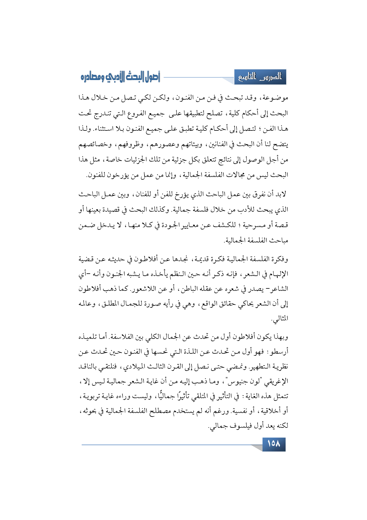 موضوعة، وقد تبحث في فن من الفنون، ولكن لكي تصل من خلال هذا البحث إلى أحكام كلية، تصلح لتطبيقها على جميع الفروع التي تندرج تحت هذا الفن؛ لتصل إلى أحكام كلية تطبق على جميع الفنون بلا استثناء. ولذا يتضح لنا أن البحث في الفنانين، وبيئاتهم وعصورهم، وظروفهم، وخصائصهم من أجل الوصول إلى نتائج تتعلق بكل جزئية من تلك الجزئيات خاصة، مثل هذا البحث ليس من مجالات الفلسفة الجمالية، وإنما من عمل من يؤرخون للفنون.