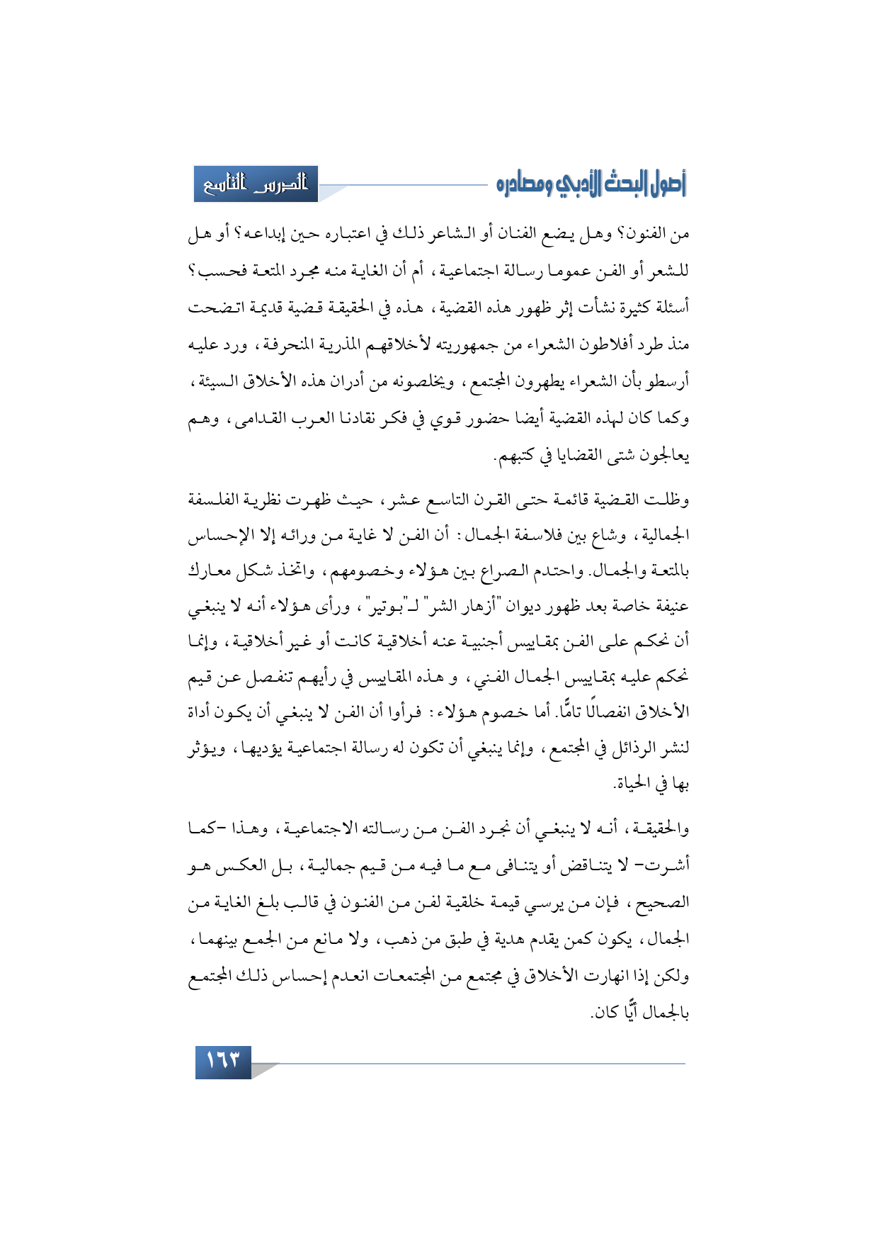 من الفنون؟ وهل يضع الفنان أو الشاعر ذلك في اعتباره حين إبداعه؟ أو هل للشعر أو الفن عموما رسالة اجتماعية، أم أن الغاية منه مجرد المتعة فحسب؟ أسئلة كثيرة نشأت إثر ظهور هذه القضية، هذه في الحقيقة قضية قديمة اتضحت منذ طرد أفلاطون الشعراء من جمهوريته لأخلاقهم المذرية المنحرفة، ورد عليه أرسطو بأن الشعراء يطهرون المجتمع، ويخلصونه من أدران هذه الأخلاق السيئة، وكما كان لهذه القضية أيضا حضور قوي في فكر نقادنا العرب القدامى، وهم يعالجون شتى القضايا في كتبهم.