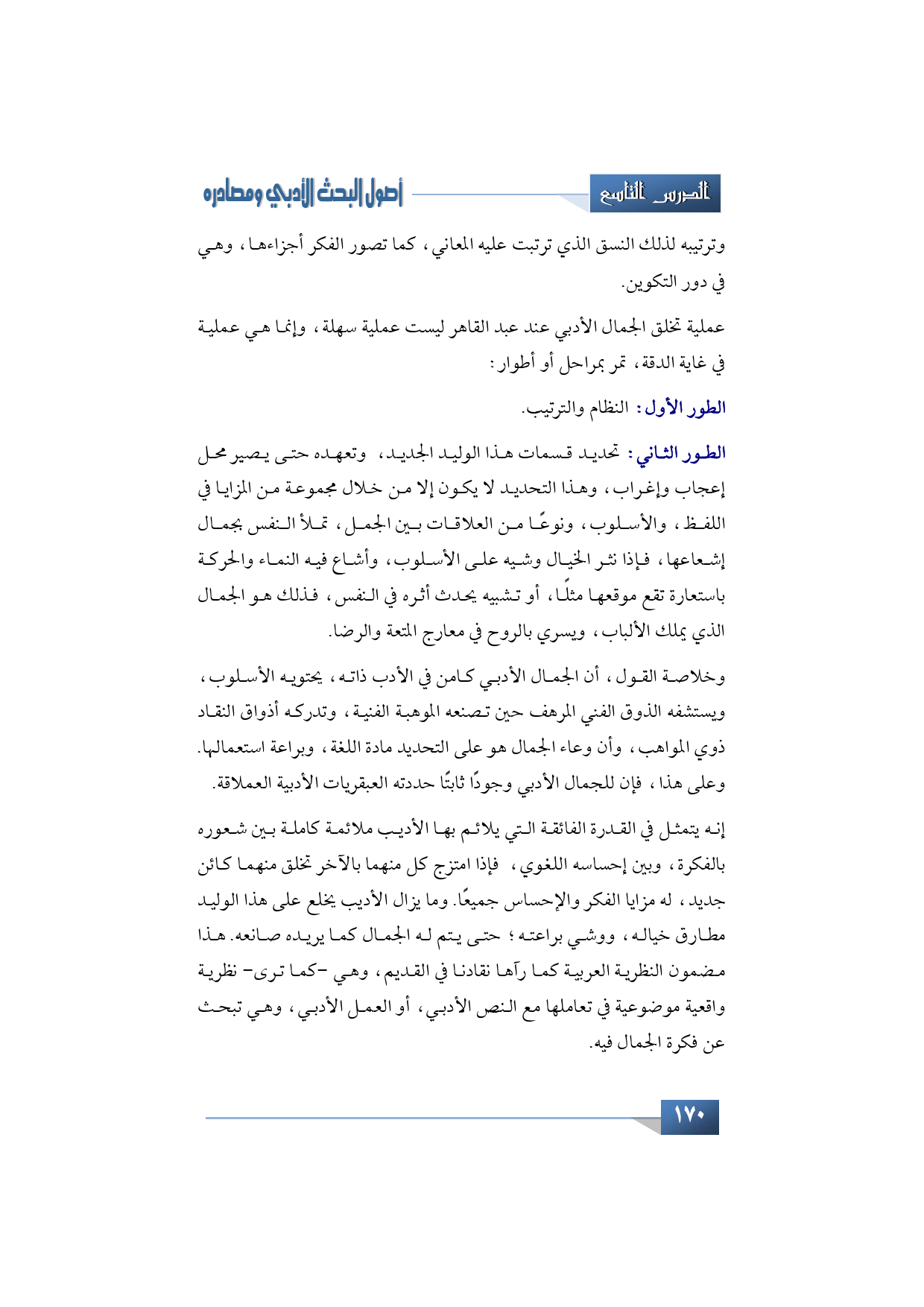 عملية تخلق الجمال الأدبي عند عبد القاهر ليست عملية سهلة، وإنما هي عملية في غاية الدقة، تمر بمراحل أو أطوار: