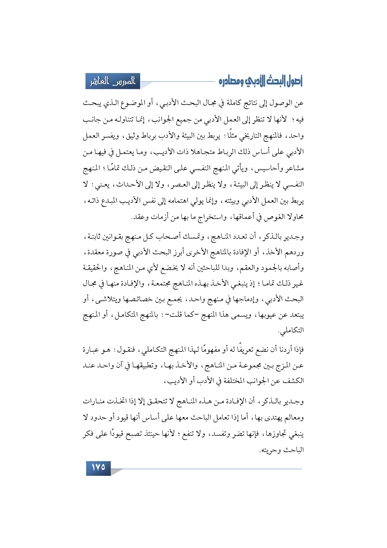 وجدير بالذكر، أن تعدد المناهج، وتمسك أصحاب كل منهج بقوانين ثابتة، وردهم الأخذ، أو الإفادة بالمناهج الأخرى أبرز البحث الأدبي في صورة معقدة، وأصابه بالجمود والعقم، وبدا للباحثين أنه لا يخضع لأي من المناهج، والحقيقة غير ذلك تماما؛ إذ ينبغي الأخذ بهذه المناهج مجتمعة، والإفادة منها في مجال البحث الأدبي، وإدماجها في منهج واحد، يجمع بين خصائصها ويتلاشى، أو يبتعد عن عيوبها، ويسمى هذا المنهج -كما قلت-: بالمنهج المتكامل، أو المنهج التكاملي.