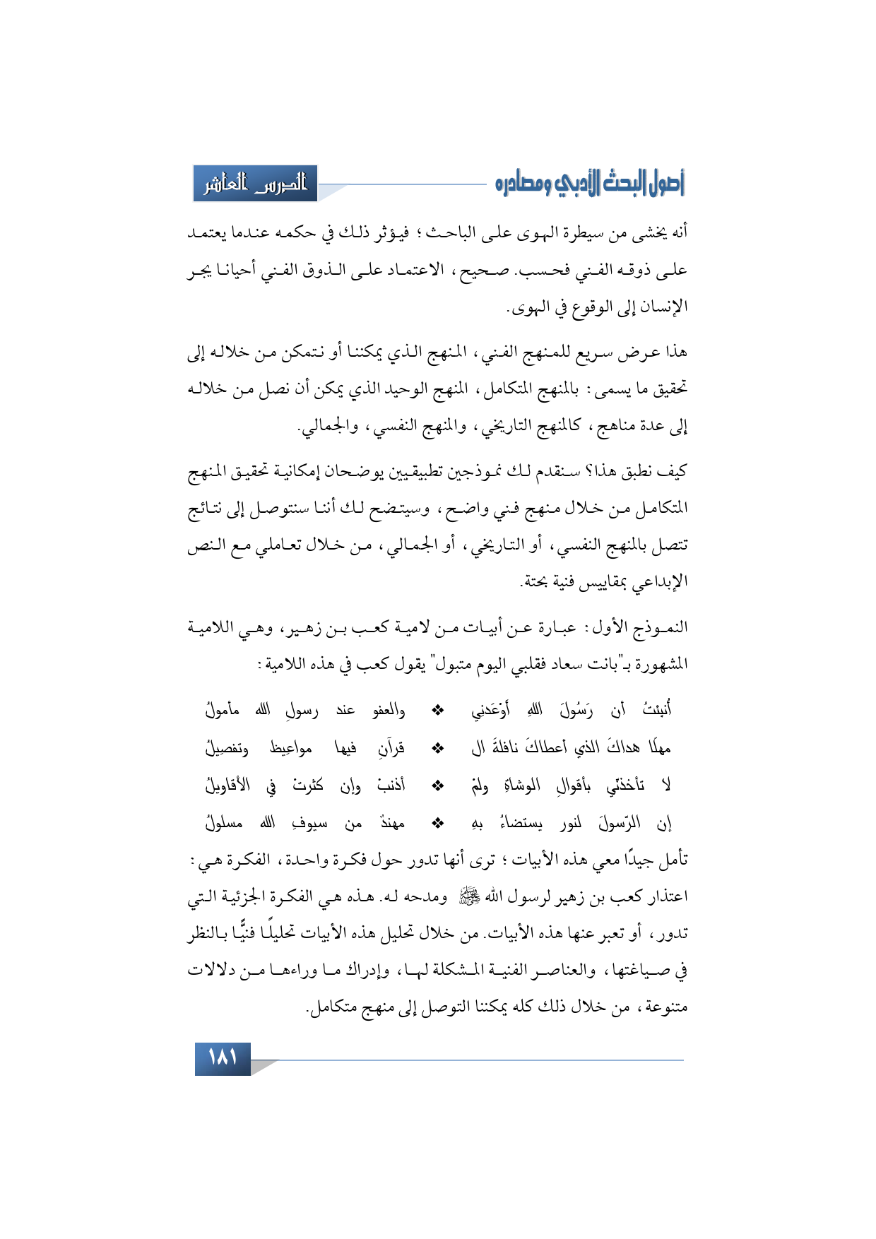 تأمل جيدًا معي هذه الأبيات؛ ترى أنها تدور حول فكرة واحدة، الفكرة هي: اعتذار كعب بن زهير لرسول الله -صلى الله عليه وسلم- ومدحه له. هذه هي الفكرة الجزئية التي تدور، أو تعبر عنها هذه الأبيات. من خلال تحليل هذه الأبيات تحليلًا فنيًّا بالنظر في صياغتها، والعناصر الفنية المشكلة لها، وإدراك ما وراءها من دلالات متنوعة، من خلال ذلك كله يمكننا التوصل إلى منهج متكامل.