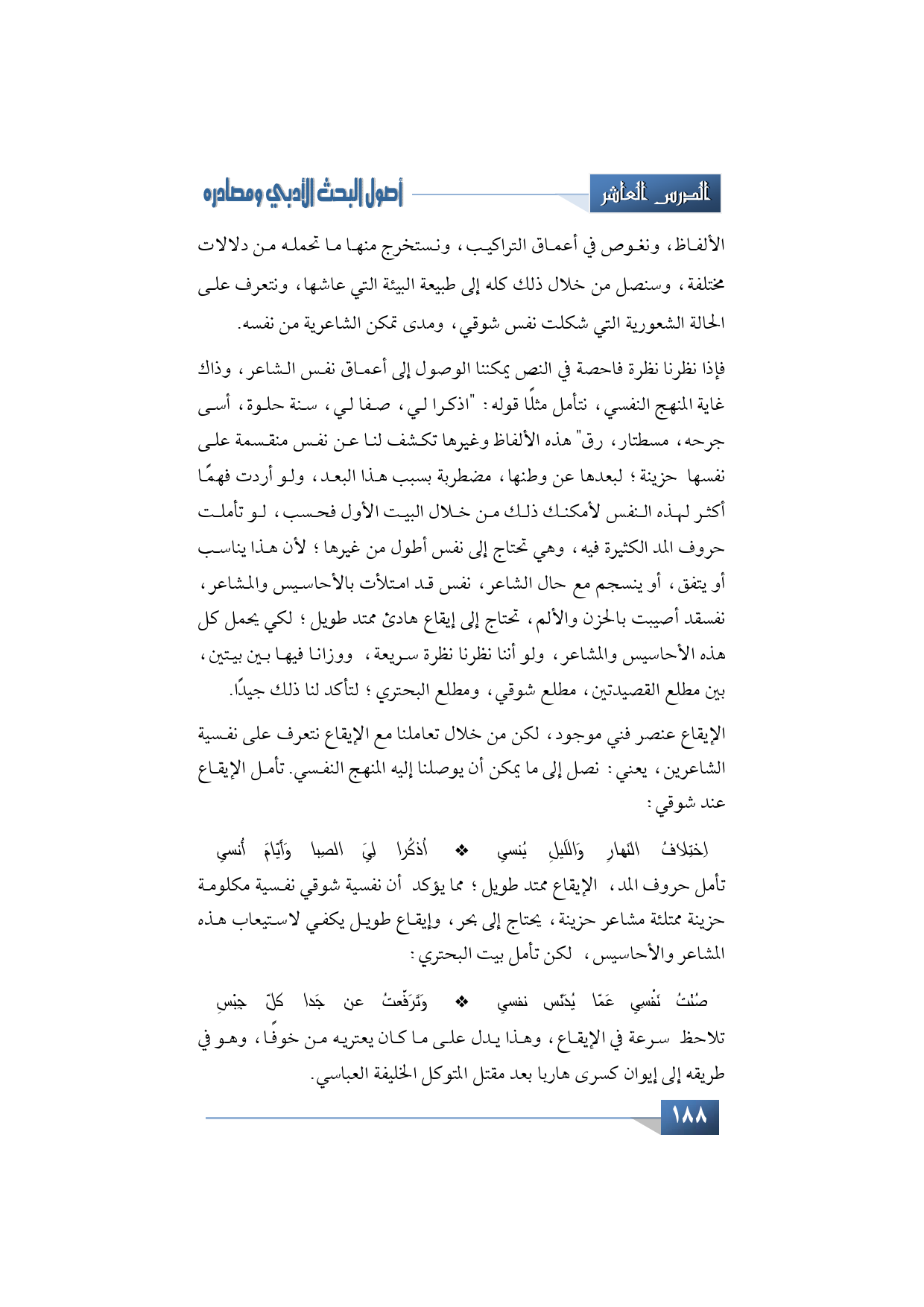 تأمل حروف المد، الإيقاع ممتد طويل؛ مما يؤكد أن نفسية شوقي نفسية مكلومة حزينة ممتلئة مشاعر حزينة، يحتاج إلى بحر، وإيقاع طويل يكفي لاستيعاب هذه المشاعر والأحاسيس، لكن تأمل بيت البحتري:
