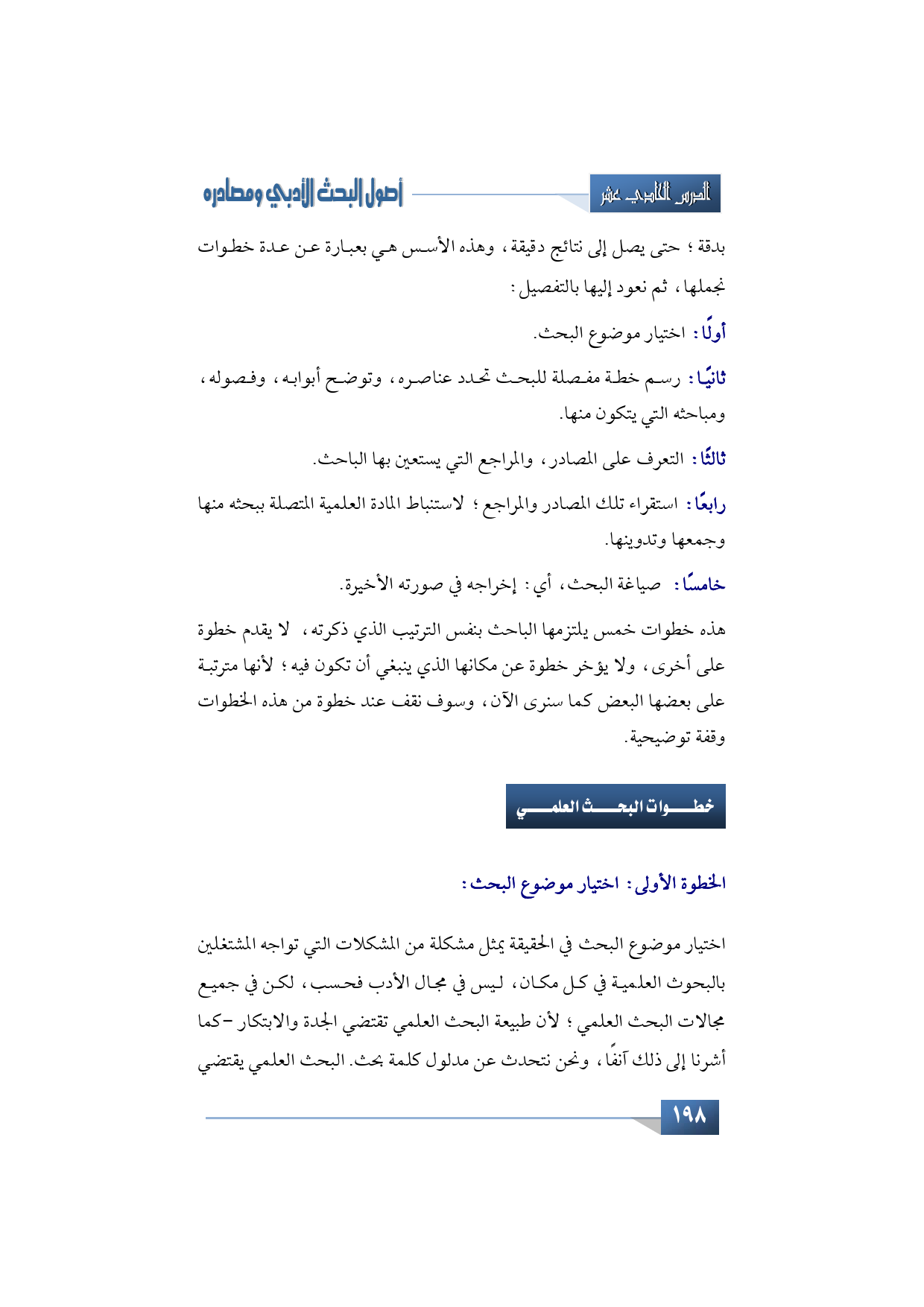 هذه خطوات خمس يلتزمها الباحث بنفس الترتيب الذي ذكرته، لا يقدم خطوة على أخرى، ولا يؤخر خطوة عن مكانها الذي ينبغي أن تكون فيه؛ لأنها مترتبة على بعضها البعض كما سنرى الآن، وسوف نقف عند خطوة من هذه الخطوات وقفة توضيحية.