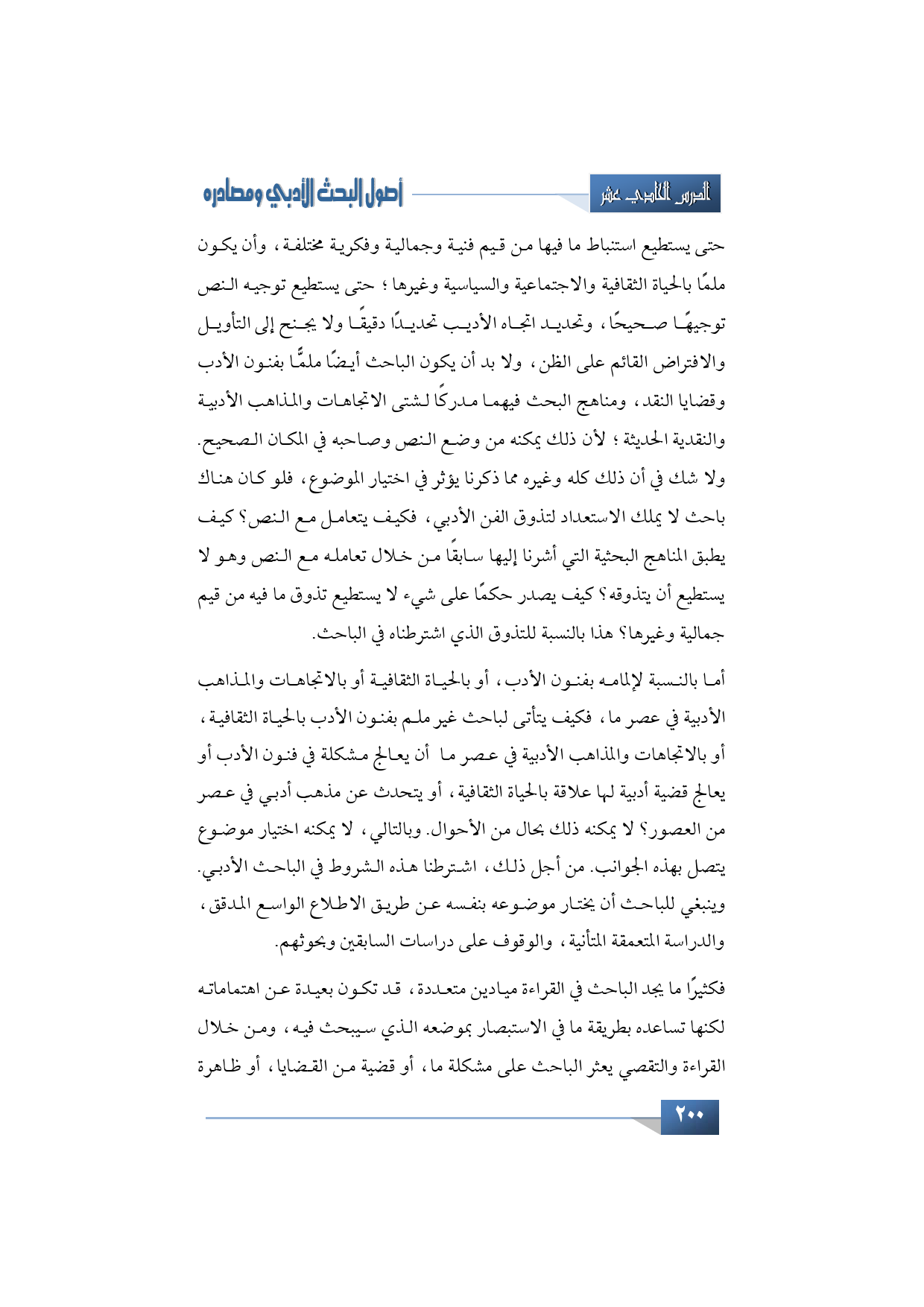 حتى يستطيع استنباط ما فيها من قيم فنية وجمالية وفكرية مختلفة، وأن يكون ملمًا بالحياة الثقافية والاجتماعية والسياسية وغيرها؛ حتى يستطيع توجيه النص توجيهًا صحيحًا، وتحديد اتجاه الأديب تحديدًا دقيقًا ولا يجنح إلى التأويل والافتراض القائم على الظن، ولا بد أن يكون الباحث أيضًا ملمًّا بفنون الأدب وقضايا النقد، ومناهج البحث فيهما مدركًا لشتى الاتجاهات والمذاهب الأدبية والنقدية الحديثة؛ لأن ذلك يمكنه من وضع النص وصاحبه في المكان الصحيح. ولا شك في أن ذلك كله وغيره مما ذكرنا يؤثر في اختيار الموضوع، فلو كان هناك باحث لا يملك الاستعداد لتذوق الفن الأدبي فكيف يتعامل مع النص، لا بد أن يتعرض له، كيف يتعامل مع النص وهو ليس عنده قدر من التذوق الفني له؟ كيف يطبق المناهج البحثية التي أشرنا إليها سابقًا من خلال تعامله مع النص وهو لا يستطيع أن يتذوقه؟ كيف يصدر حكمًا على شيء لا يستطيع تذوق ما فيه من قيم جمالية وغيرها؟ هذا بالنسبة للتذوق الذي اشترطناه في الباحث.