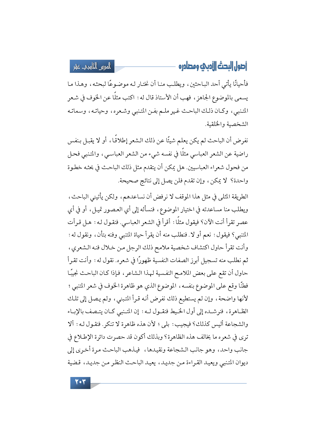 فأحيانًا يأتي أحد الباحثين، ويطلب منا أن نختار له موضوعًا لبحثه، وهذا ما يسمى بالموضوع الجاهز، فهب أن الأستاذ قال له: اكتب مثلًا عن الخوف في شعر المتنبي، وكان ذلك الباحث غير ملم بفن المتنبي وشعره، وحياته، وسماته الشخصية والخلقية. نفرض أن الباحث لم يكن يعلم شيئًا عن ذلك الشعر إطلاقًا، أو لا يقبل بنفس راضية عن الشعر العباسي مثلًا في نفسه شيء من الشعر العباسي، والمتنبي فحل من فحول شعراء العباسيين. هل يمكن أن يتقدم مثل ذلك الباحث في بحثه خطوة واحدة؟ لا يمكن، وإن تقدم فلن يصل إلى نتائج صحيحة. الطريقة المثلى في مثل هذا الموقف لا أرفض أن أساعدهم، ولكن يأتيني الباحث، ويطلب مني مساعدته في اختيار الموضوع، فأسأله إلى أي العصور تميل يا بني، أو في أي عصر تقرأ أنت الآن؟ فيقول مثلًا: أقرأ في الشعر العباسي. فأقول له: هل قرأت المتنبي؟ فيقول: نعم أو لا. فأطلب منه أن يقرأ حياة المتنبي وفنه بتأن، وأقول له: وأنت تقرأ حاول اكتشاف شخصية ملامح ذلك الرجل من خلال فنه الشعري، ثم أطلب منه تسجيل أبرز الصفات النفسية ظهورًا في شعره. أقول له: وأنت تقرأ حاول أن تقع على بعض الملامح النفسية لهذا الشاعر، فإذا كان الباحث نجيبًا فطنًا وقع على الموضوع بنفسه، الموضوع الذي هو ظاهرة الخوف في شعر المتنبي؛ لأنها واضحة، وإن لم يستطيع ذلك نفرض أنه قرأ المتبني، ولم يصل إلى تلك الظاهرة نفرض أرشده إلى أول الخيط فأقول له: يا بني إن المتنبي كان يتصف بالإباء والشجاعة أليس كذلك؟ فيجيب: بلى؛ لأن هذه ظاهرة لا تنكر. فأقول له: ألا ترى في شعره ما يخالف هذه الظاهرة؟ وبذلك أكون قد حصرت دائرة الإطلاع في جانب واحد، وهو جانب الشجاعة ونقيضها فيذهب الباحث مرة أخرى إلى ديوان المتنبي ويعيد القراءة من جديد، يعيد الباحث النظر من جديد هذه قضية