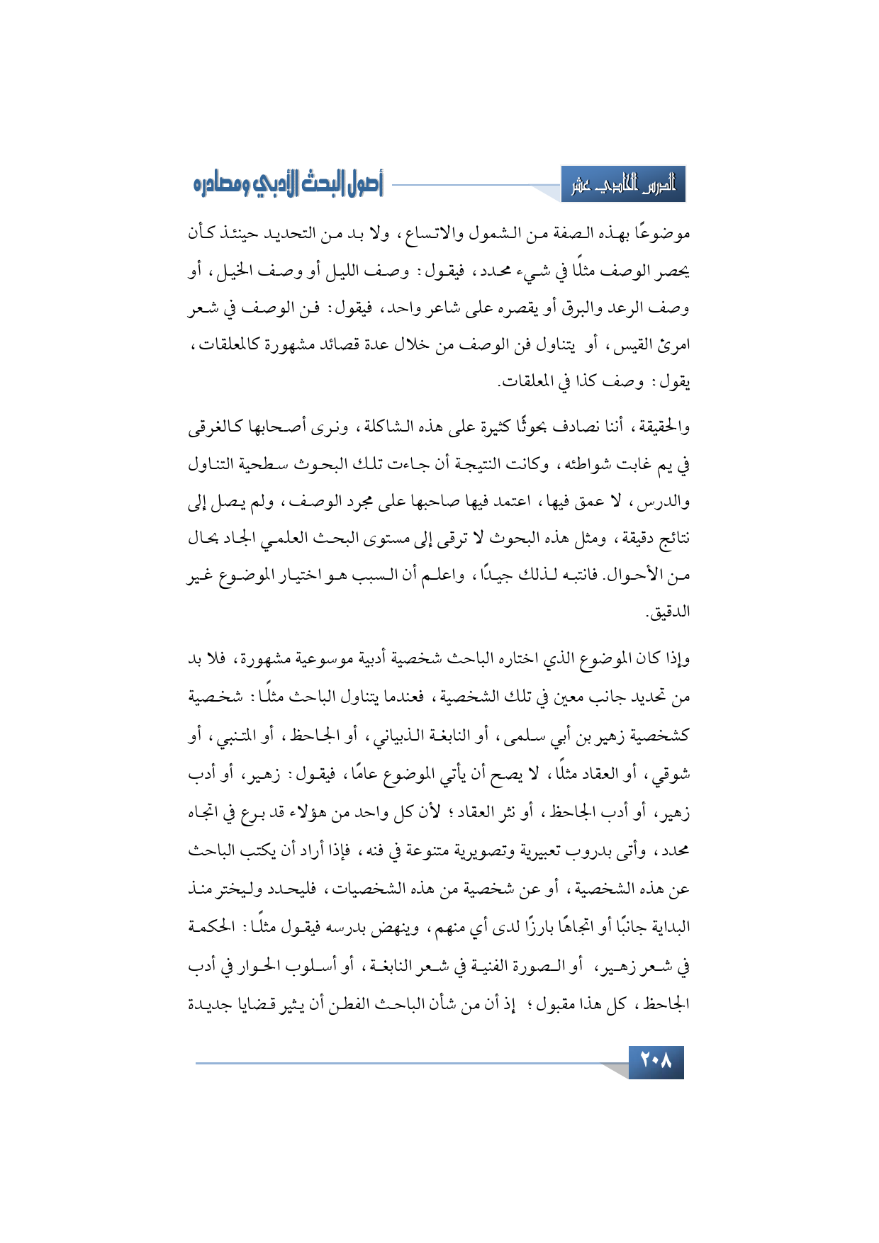 موضوعًا بهذه الصفة من الشمول والاتساع، ولا بد من التحديد حينئذ كأن يحصر الوصف مثلًا في شيء محدد، فيقول: وصف الليل أو وصف الخيل، أو وصف الرعد والبرق أو يقصره على شاعر واحد، فيقول: فن الوصف في شعر امرئ القيس، أو يتناول فن الوصف من خلال عدة قصائد مشهورة كالمعلقات، يقول: وصف كذا في المعلقات.