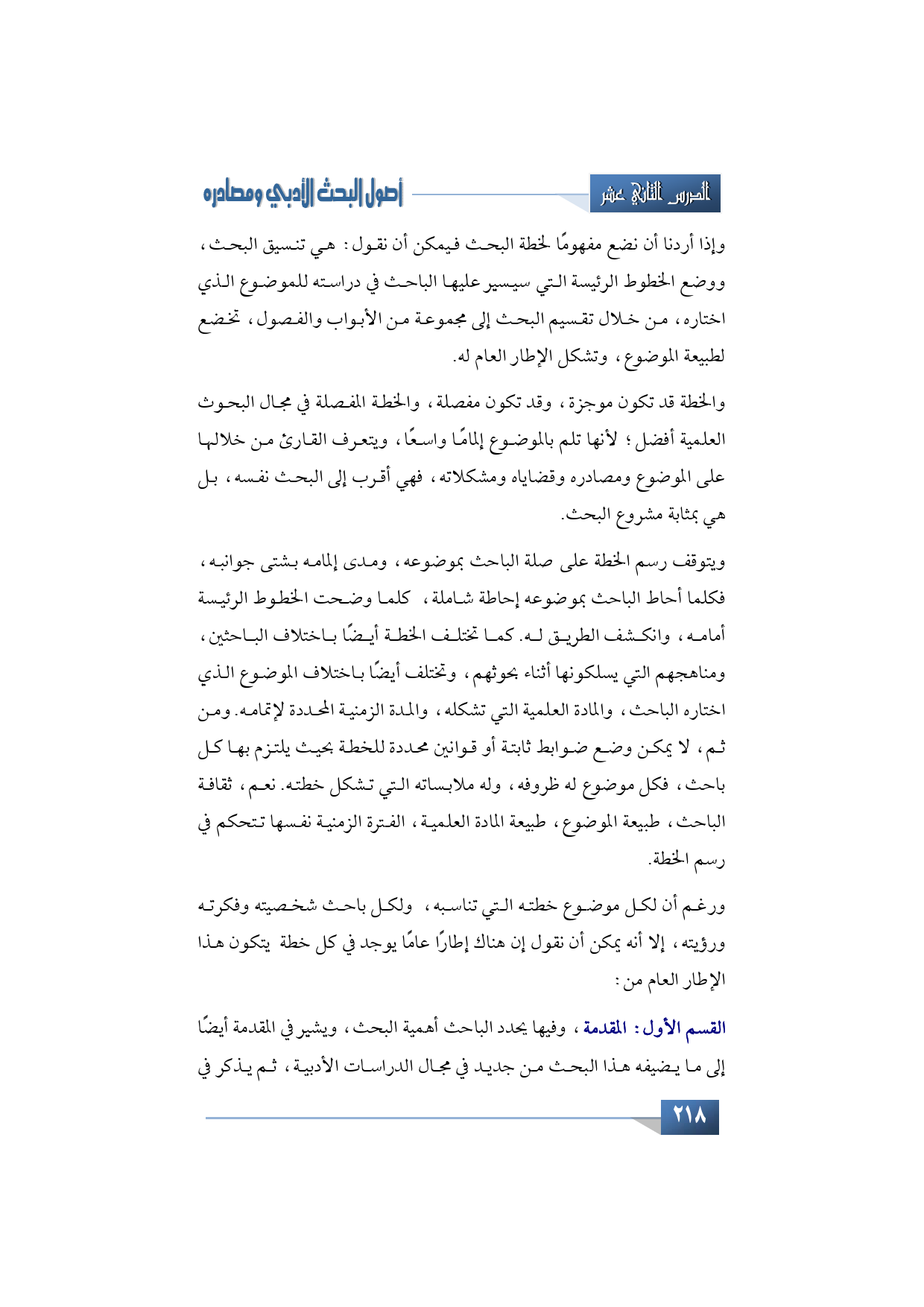 ويتوقف رسم الخطة على صلة الباحث بموضوعه، ومدى إلمامه بشتى جوانبه، فكلما أحاط الباحث بموضوعه إحاطة شاملة، كلما وضحت الخطوط الرئيسة أمامه، وانكشف الطريق له. كما تختلف الخطة أيضًا باختلاف الباحثين، ومناهجهم التي يسلكونها أثناء بحوثهم، وتختلف أيضًا باختلاف الموضوع الذي اختاره الباحث، والمادة العلمية التي تشكله، والمدة الزمنية المحددة لإتمامه. ومن ثم، لا يمكن وضع ضوابط ثابتة أو قوانين محددة للخطة بحيث يلتزم بها كل باحث، فكل موضوع له ظروفه، وله ملابساته التي تشكل خطته. نعم، ثقافة الباحث، طبيعة الموضوع، طبيعة المادة العلمية، الفترة الزمنية نفسها تتحكم في رسم الخطة. ورغم أن لكل موضوع خطته التي تناسبه، ولكل باحث شخصيته وفكرته ورؤيته، إلا أنه يمكن أن نقول إن هناك إطارًا عامًا يوجد في كل خطة يتكون هذا الإطار العام من أولًا: المقدمة، وفيها يحدد الباحث أهمية البحث، ويشير في المقدمة أيضًا إلى ما يضيفه هذا البحث من جديد في مجال الدراسات الأدبية، ثم يذكر في