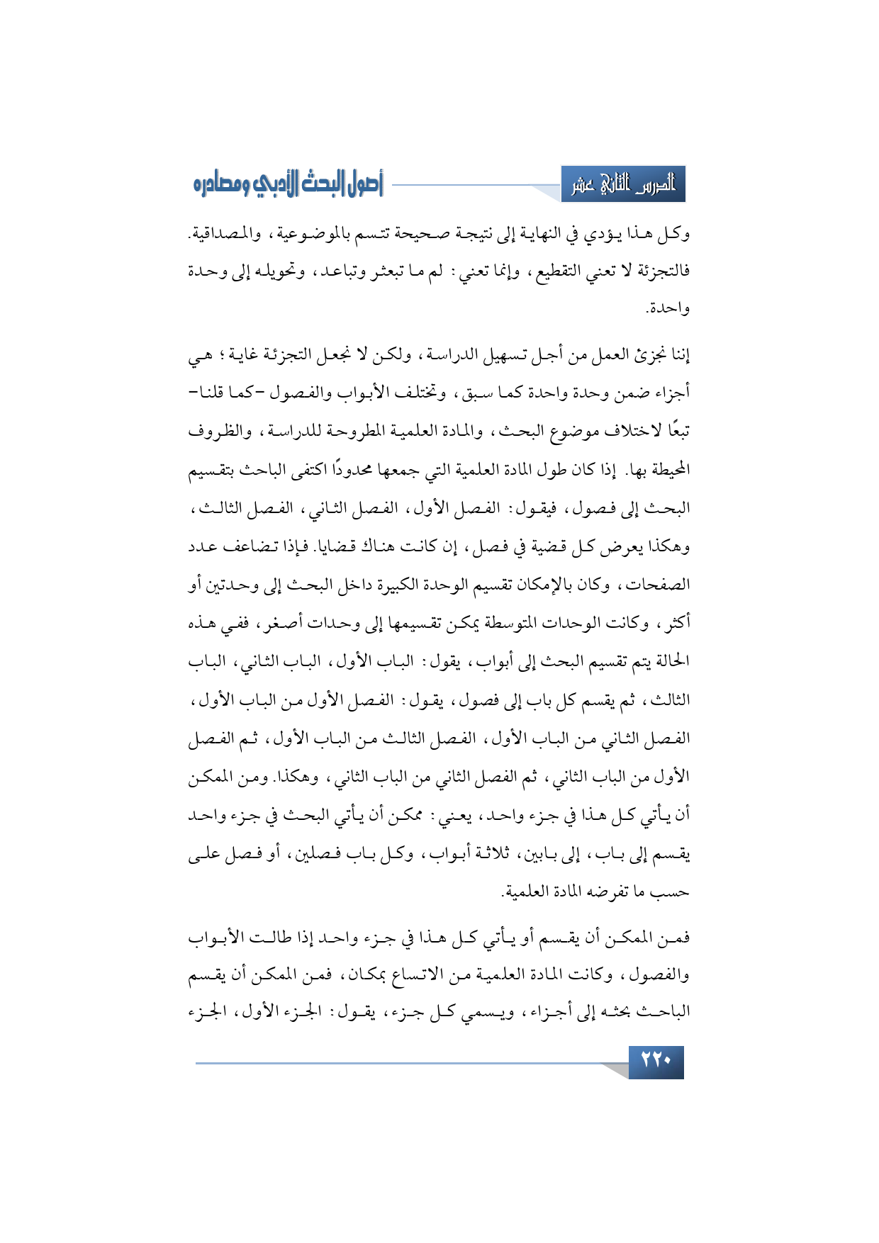 وكل هذا يؤدي في النهاية إلى نتيجة صحيحة تتسم بالموضوعية، والمصداقية. فالتجزئة لا تعني التقطيع، وإنما تعني: لم ما تبعثر وتباعد، وتحويله إلى وحدة واحدة. إننا نجزئ العمل من أجل تسهيل الدراسة، ولكن لا نجعل التجزئة غاية؛ هي أجزاء ضمن وحدة واحدة كما سبق، وتختلف الأبواب والفصول -كما قلت-؛ تبعًا لاختلاف موضوع البحث، والمادة العلمية المطروحة للدراسة، والظروف المحيطة بها. إذا كان طول المادة العلمية التي جمعها محدودًا اكتفى الباحث بتقسيم البحث إلى فصول، فيقول: الفصل الأول، الفصل الثاني، الفصل الثالث، وهكذا يعرض كل قضية في فصل، إن كانت هناك قضايا. فإذا تضاعف عدد الصفحات، وكان بالإمكان تقسيم الوحدة الكبيرة داخل البحث إلى وحدتين أو أكثر، وكانت الوحدات المتوسطة يمكن تقسيمها إلى وحدات أصغر، ففي هذه الحالة يتم تقسيم البحث إلى أبواب، يقول: الباب الأول، الباب الثاني، الباب الثالث، ثم يقسم كل باب إلى فصول، يقول: الفصل الأول من الباب الأول، الفصل الثاني من الباب الأول، الفصل الثالث من الباب الأول، ثم الفصل الأول من الباب الثاني، ثم الفصل الثاني من الباب الثاني، وهكذا. ومن الممكن أن يأتي كل هذا في جزء واحد، يعني: ممكن أن يأتي البحث في جزء واحد يقسم إلى باب، إلى بابين، ثلاثة أبواب، وكل باب فصلين، أو فصل على حسب ما تفرضه المادة العلمية.