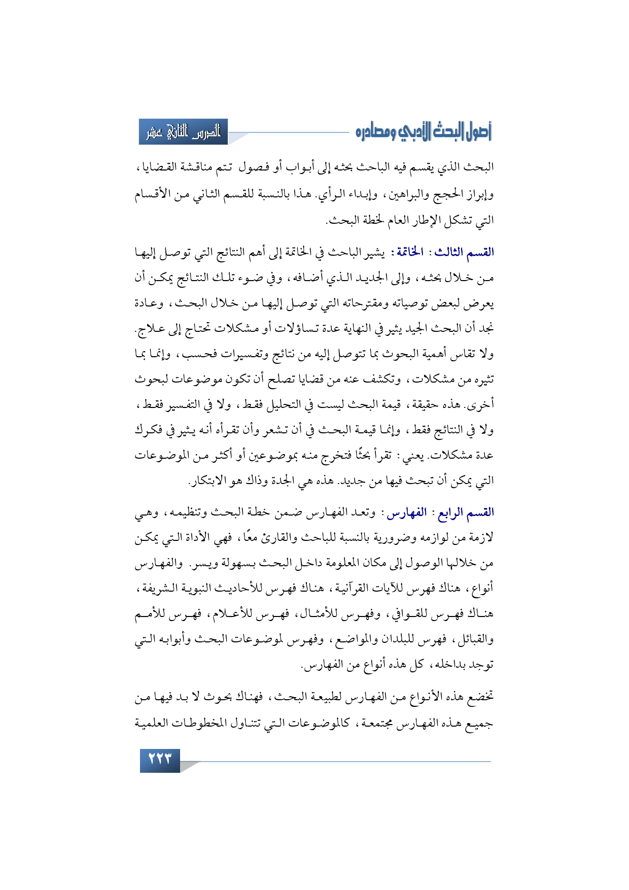 القسم الثالث من هذا الإطار: الخاتمة: يشير الباحث في الخاتمة إلى أهم النتائج التي توصل إليها من خلال بحثه، وإلى الجديد الذي أضافه، وفي ضوء تلك النتائج يمكن أن يعرض لبعض توصياته ومقترحاته التي توصل إليها من خلال البحث، وعادة نجد أن البحث الجيد يثير في النهاية عدة تساؤلات أو مشكلات تحتاج إلى علاج. ولا تقاس أهمية البحوث بما تتوصل إليه من نتائج وتفسيرات فحسب، وإنما بما تثيره من مشكلات، وتكشف عنه من قضايا تصلح أن تكون موضوعات لبحوث أخرى. هذه حقيقة، قيمة البحث ليست في التحليل فقط، ولا في التفسير فقط، ولا في النتائج فقط، وإنما قيمة البحث في أن تشعر وأن تقرأه أنه يثير في فكرك عدة مشكلات. يعني: تقرأ بحثًا فتخرج منه بموضوعين أو أكثر من الموضوعات التي يمكن أن تبحث فيها من جديد. هذه هي الجدة وذاك هو الابتكار.