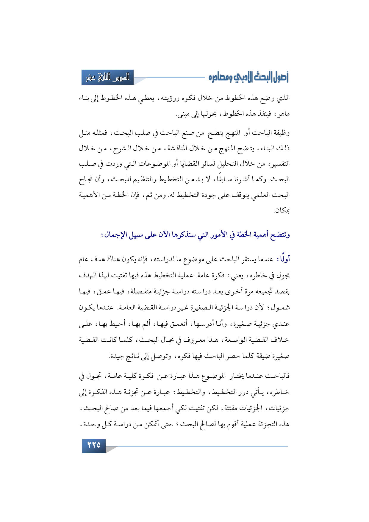 أولًا: عندما يستقر الباحث على موضوع ما لدراسته، فإنه يكون هناك هدف عام يجول في خاطره، يعني: فكرة عامة. عملية التخطيط هذه فيها تفتيت لهذا الهدف بقصد تجميعه مرة أخرى بعد دراسته دراسة جزئية منفصلة، فيها عمق، فيها شمول؛ لأن دراسة الجزئية الصغيرة غير دراسة القضية العامة. عندما يكون عندي جزئية صغيرة، وأنا أدرسها، أتعمق فيها، ألم بها، أحيط بها، على خلاف القضية الواسعة، هذا معروف في مجال البحث، كلما كانت القضية صغيرة ضيقة كلما حصر الباحث فيها فكره، وتوصل إلى نتائج جيدة.