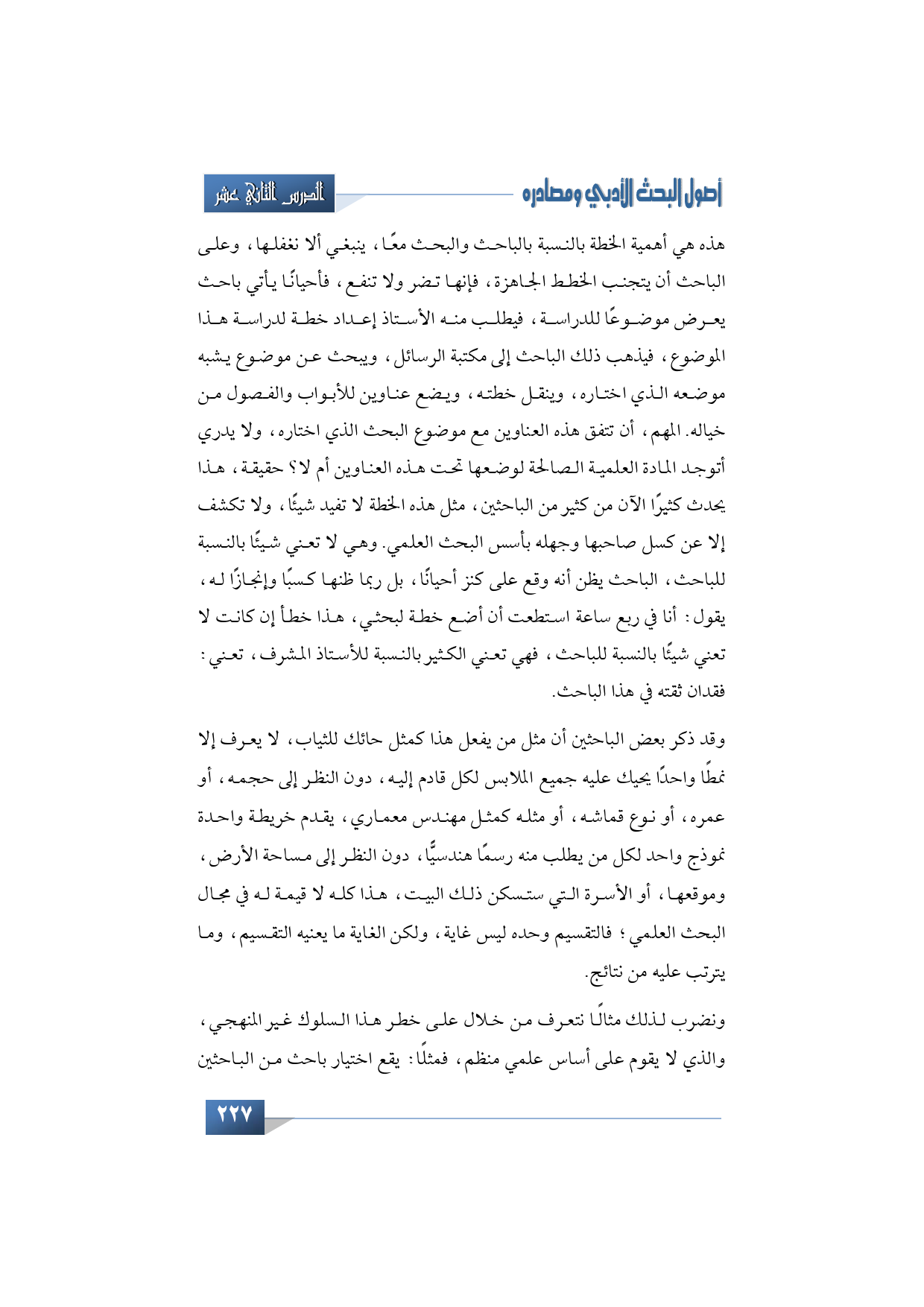 هذه هي أهمية الخطة بالنسبة بالباحث والبحث معًا، ينبغي ألا نغفلها، وعلى الباحث أن يتجنب الخطط الجاهزة، فإنها تضر ولا تنفع، فأحيانًا يأتي باحث يعرض موضوعًا للدراسة، فيطلب منه الأستاذ إعداد خطة لدراسة هذا الموضوع، فيذهب ذلك الباحث إلى مكتبة الرسائل، ويبحث عن موضوع يشبه موضعه الذي اختاره، وينقل خطته، ويضع عناوين للأبواب والفصول من خياله. المهم، أن تتفق هذه العناوين مع موضوع البحث الذي اختاره، ولا يدري أتوجد المادة العلمية الصالحة لوضعها تحت هذه العناوين أم لا؟ حقيقة، هذا يحدث كثيرًا الآن من كثير من الباحثين، مثل هذه الخطة لا تفيد شيئًا، ولا تكشف إلا عن كسل صاحبها وجهله بأسس البحث العلمي. وهي لا تعني شيئًا بالنسبة للباحث، الباحث يظن أنه وقع على كنز أحيانًا، بل ربما ظنها كسبًا وإنجازًا له، يقول: أنا في ربع ساعة استطعت أن أضع خطة لبحثي، هذا خطأ إن كانت لا تعني شيئًا بالنسبة للباحث، فهي تعني الكثير بالنسبة للأستاذ المشرف، تعني: فقدان ثقته في هذا الباحث.