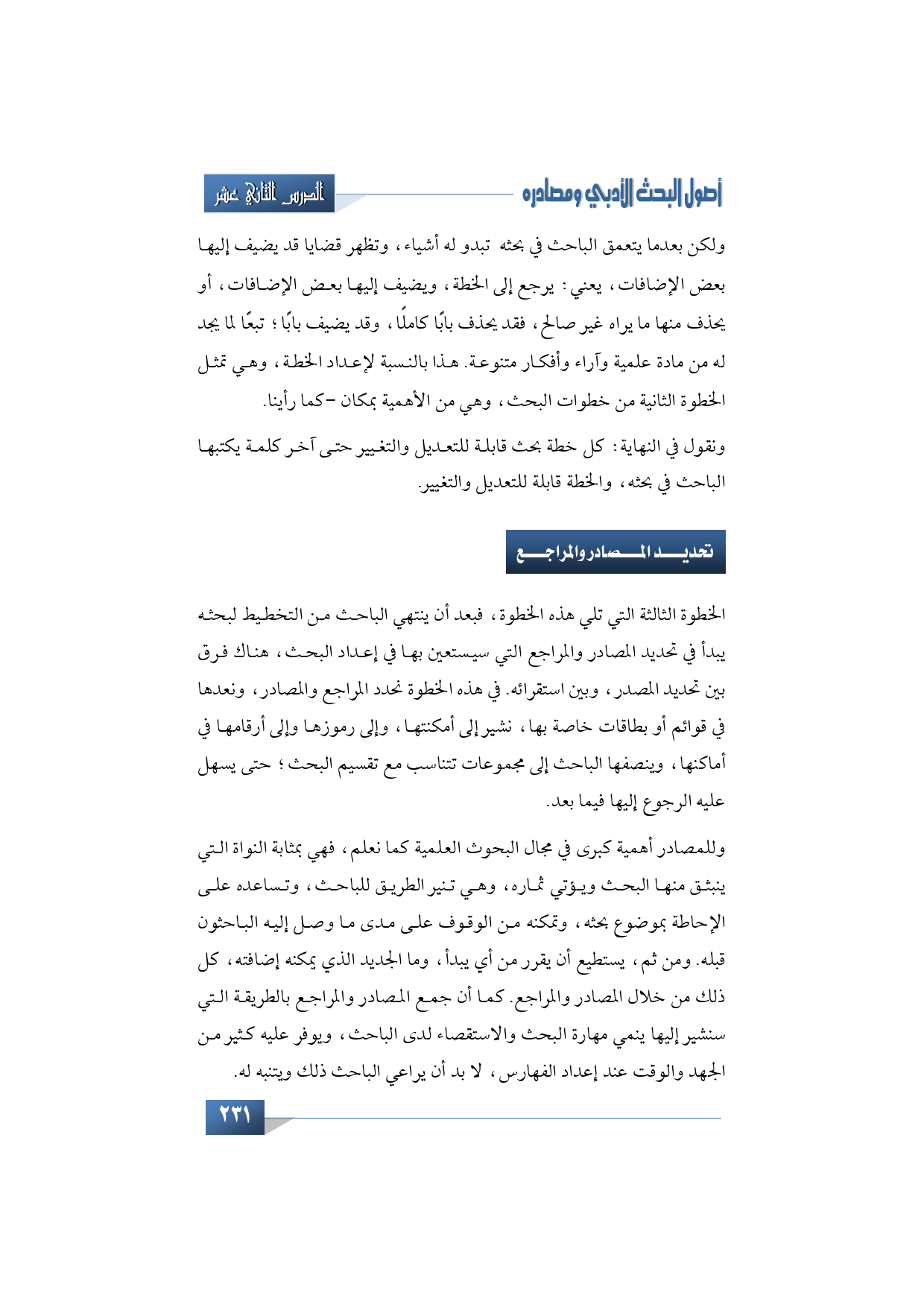 الخطوة الثالثة التي تلي هذه الخطوة: فبعد أن ينتهي الباحث من التخطيط لبحثه يبدأ في تحديد المصادر والمراجع التي سيستعين بها في إعداد البحث، هناك فرق بين تحديد المصدر، وبين استقرائه. في هذه الخطوة نحدد المراجع والمصادر، ونعدها في قوائم أو بطاقات خاصة بها، نشير إلى أمكنتها، وإلى رموزها وإلى أرقامها في أماكنها، وينصفها الباحث إلى مجموعات تتناسب مع تقسيم البحث؛ حتى يسهل عليه الرجوع إليها فيما بعد.