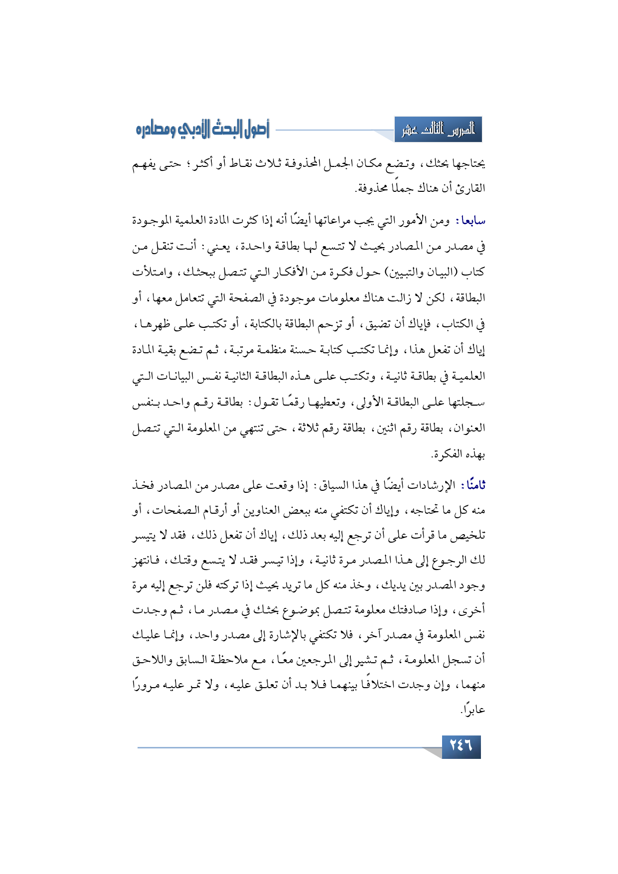 7 - ومن الأمور التي يجب مراعاتها أيضًا أنه إذا كثرت المادة العلمية الموجودة في مصدر من المصادر بحيث لا تتسع لها بطاقة واحدة، يعني: أنت تنقل من كتاب (البيان والتبيين) حول فكرة من الأفكار التي تتصل ببحثك، وامتلأت البطاقة، لكن لا زالت هناك معلومات موجودة في الصفحة التي تتعامل معها، أو في الكتاب، فإياك أن تضيق، أو تزحم البطاقة بالكتابة، أو تكتب على ظهرها، إياك أن تفعل هذا، وإنما تكتب كتابة حسنة منظمة مرتبة، ثم تضع بقية المادة العلمية في بطاقة ثانية، وتكتب على هذه البطاقة الثانية نفس البيانات التي سجلتها على البطاقة الأولى، وتعطيها رقمًا تقول: بطاقة رقم واحد بنفس العنوان، بطاقة رقم اثنين، بطاقة رقم ثلاثة، حتى تنتهي من المعلومة التي تتصل بهذه الفكرة.