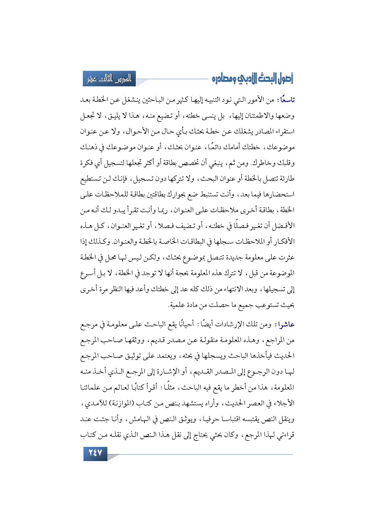 10 - ومن تلك الإرشادات أيضًا: أحيانًا يقع الباحث على معلومة في مرجع من المراجع، وهذه المعلومة منقولة عن مصدر قديم، ووثقها صاحب المرجع الحديث فيأخذها الباحث ويسجلها في بحثه، ويعتمد على توثيق صاحب المرجع لها دون الرجوع إلى المصدر القديم، أو الإشارة إلى المرجع الذي أخذ منه المعلومة، هذا من أخطر ما يقع فيه الباحث، يعني: مثلًا: أقرأ كتابًا لعالم من علمائنا الأجلاء في العصر الحديث، وأراه يستشهد بنص من كتاب (الموازنة) للآمدي، وينقل النص يقتبسه اقتباسا حرفيا، ويوثق النص في الهامش، وأنا جئت عند قراءتي لهذا المرجع، وكان بحثي يحتاج إلى نقل هذا النص الذي نقله من كتاب