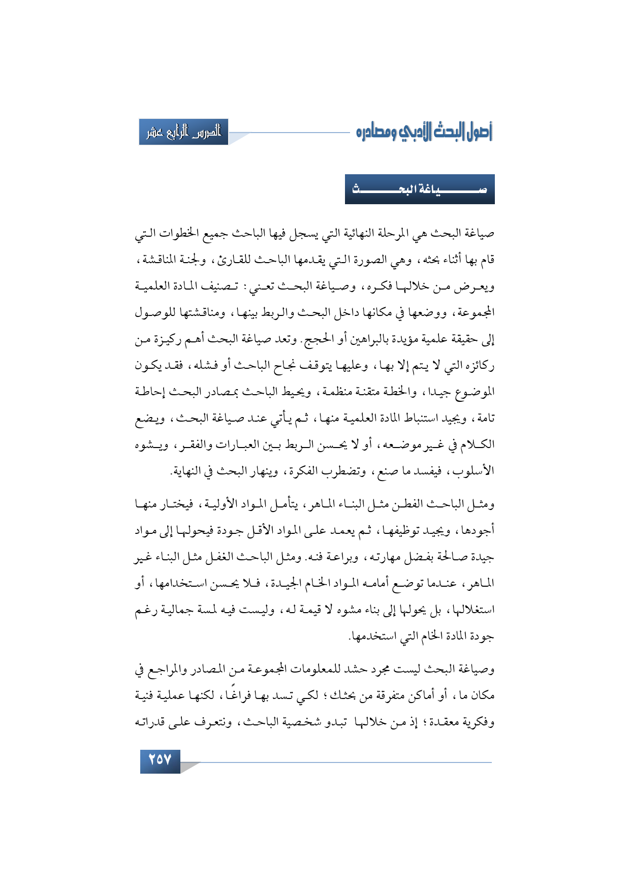 وصياغة البحث: هي المرحلة النهائية التي يسجل فيها الباحث جميع الخطوات التي قام بها أثناء بحثه، وهي الصورة التي يقدمها الباحث للقارئ، ولجنة المناقشة، ويعرض من خلالها فكره، وصياغة البحث تعني: تصنيف المادة العلمية المجموعة، ووضعها في مكانها داخل البحث والربط بينها، ومناقشتها للوصول إلى حقيقة علمية مؤيدة بالبراهين أو الحجج. وتعد صياغة البحث أهم ركيزة من ركائزه التي لا يتم إلا بها، وعليها يتوقف نجاح الباحث أو فشله، فقد يكون الموضوع جيدا، والخطة متقنة منظمة، ويحيط الباحث بمصادر البحث إحاطة تامة، ويجيد استنباط المادة العلمية منها، ثم يأتي عند صياغة البحث، ويضع الكلام في غير موضعه، أو لا يحسن الربط بين العبارات والفقر، ويشوه الأسلوب، فيفسد ما صنع، وتضطرب الفكرة، وينهار البحث في النهاية. ومثل الباحث الفطن مثل البناء الماهر، يتأمل المواد الأولية، فيختار منها أجودها، ويجيد توظيفها، ثم يعمد على المواد الأقل جودة فيحولها إلى مواد جيدة صالحة بفضل مهارته، وبراعة فنه. ومثل الباحث الغفل مثل البناء غير الماهر، عندما توضع أمامه المواد الخام الجيدة، فلا يحسن استخدامها، أو استغلالها، بل يحولها إلى بناء مشوه لا قيمة له، وليست فيه لمسة جمالية رغم جودة المادة الخام التي استخدمها.