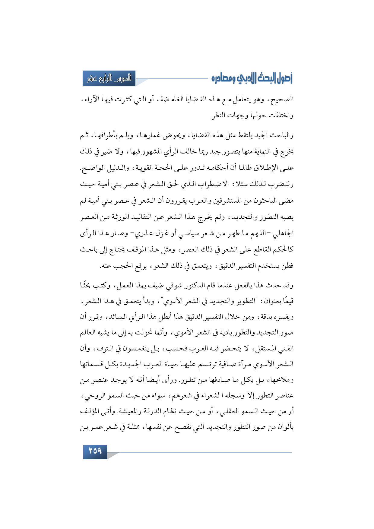 والباحث الجيد يلتقط مثل هذه القضايا، ويخوض غمارها، ويلم بأطرافها، ثم يخرج في النهاية منها بتصور جيد ربما خالف الرأي المشهور فيها، ولا ضير في ذلك على الإطلاق طالما أن أحكامه تدور على الحجة القوية، والدليل الواضح. ولنضرب لذلك مثلا: الاضطراب الذي لحق الشعر في عصر بني أمية حيث مضى الباحثون من المستشرقين والعرب يقررون أن الشعر في عصر بني أمية لم يصبه التطور والتجديد، ولم يخرج هذا الشعر عن التقاليد المورثة من العصر الجاهلي -اللهم ما ظهر من شعر سياسي أو غزل عذري- وصار هذا الرأي كالحكم القاطع على الشعر في ذلك العصر، ومثل هذا الموقف يحتاج إلى باحث فطن يستخدم التفسير الدقيق، ويتعمق في ذلك الشعر، يرفع الحجب عنه.