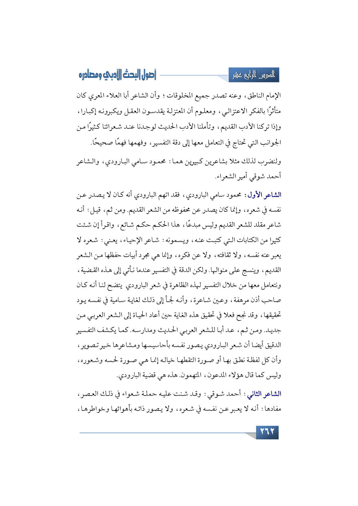ولنضرب لذلك مثلا بشاعرين كبيرين هما: محمود سامي البارودي، والشاعر أحمد شوقي أمير الشعراء، فقد اتهم البارودي أنه كان لا يصدر عن نفسه في شعره، وإنما كان يصدر عن محفوظه من الشعر القديم. ومن ثم، قيل: أنه شاعر مقلد للشعر القديم وليس مبدعا، هذا الحكم حكم شائع، واقرأ إن شئت كثيرا من الكتابات التي كتبت عنه، ويسمونه: شاعر الإحياء، يعني: شعره لا يعبر عنه نفسه، ولا ثقافته، ولا عن فكره، وإنما هي مجرد أبيات حفظها من الشعر القديم، وينسج على منوالها. ولكن الدقة في التفسير عندما نأتي إلى هذه القضية، ونتعامل معها من خلال التفسير لهذه الظاهرة في شعر البارودي يتضح لنا أنه كان صاحب أذن مرهفة، وعين شاعرة، وأنه لجأ إلى ذلك لغاية سامية في نفسه يود تحقيقها، وقد نجح فعلا في تحقيق هذه الغاية حين أعاد الحياة إلى الشعر العربي من جديد. ومن ثم، عد أبا للشعر العربي الحديث ومدارسه. كما يكشف التفسير الدقيق أيضا أن شعر البارودي يصور نفسه بأحاسيسها ومشاعرها خير تصوير، وأن كل لفظة نطق بها أو صورة التقطها خياله إنما هي صورة لحسه وشعوره، وليس كما قال هؤلاء المدعون، المتهمون. هذه هي قضية البارودي.