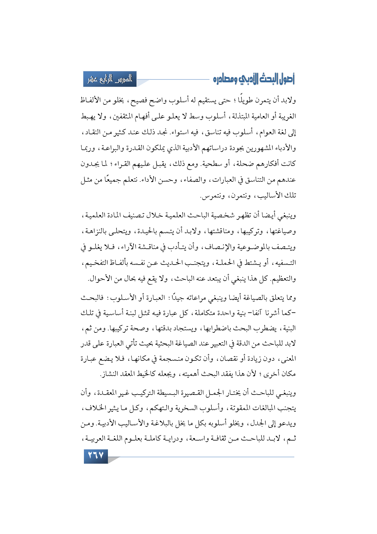 وينبغي للباحث أن يختار الجمل القصيرة البسيطة التركيب غير المعقدة، وأن يتجنب المبالغات الممقوتة، وأسلوب السخرية والتهكم، وكل ما يثير الخلاف، ويدعو إلى الجدل، ويخلو أسلوبه بكل ما يخل بالبلاغة والأساليب الأدبية. ومن ثم، لابد للباحث من ثقافة واسعة، ودراية كاملة بعلوم اللغة العربية،