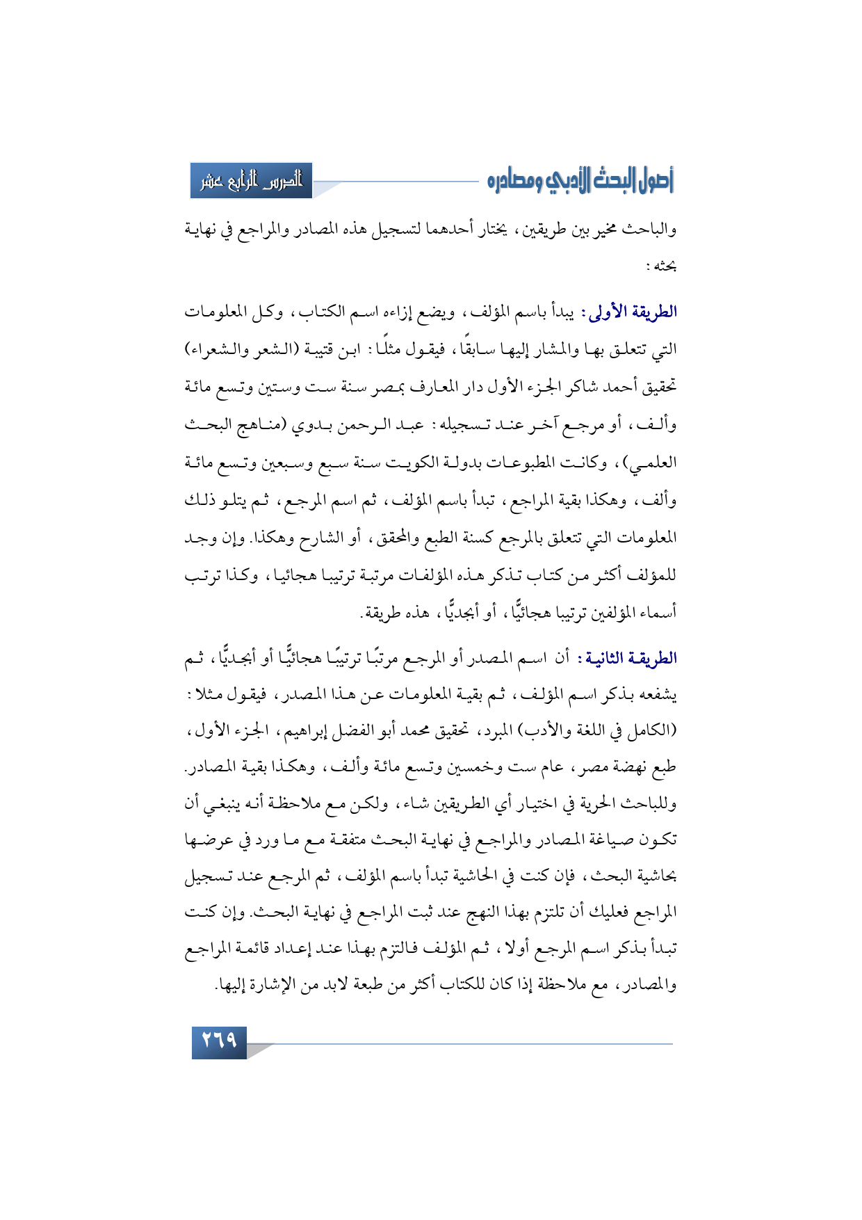 الطريقة الثانية: أن اسم المصدر أو المرجع مرتبًا ترتيبًا هجائيًّا أو أبجديًّا، ثم يشفعه بذكر اسم المؤلف، ثم بقية المعلومات عن هذا المصدر، فيقول مثلا: (الكامل في اللغة والأدب) المبرد، تحقيق محمد أبو الفضل إبراهيم، الجزء الأول، طبع نهضة مصر، عام ست وخمسين وتسع مائة وألف، وهكذا بقية المصادر. وللباحث الحرية في اختيار أي الطريقين شاء، ولكن مع ملاحظة أنه ينبغي أن تكون صياغة المصادر والمراجع في نهاية البحث متفقة مع ما ورد في عرضها بحاشية البحث، فإن كنت في الحاشية تبدأ باسم المؤلف، ثم المرجع عند تسجيل المراجع فعليك أن تلتزم بهذا النهج عند ثبت المراجع في نهاية البحث. وإن كنت تبدأ بذكر اسم المرجع أولا، ثم المؤلف فالتزم بهذا عند إعداد قائمة المراجع والمصادر، مع ملاحظة إذا كان للكتاب أكثر من طبعة لابد من الإشارة إليها.