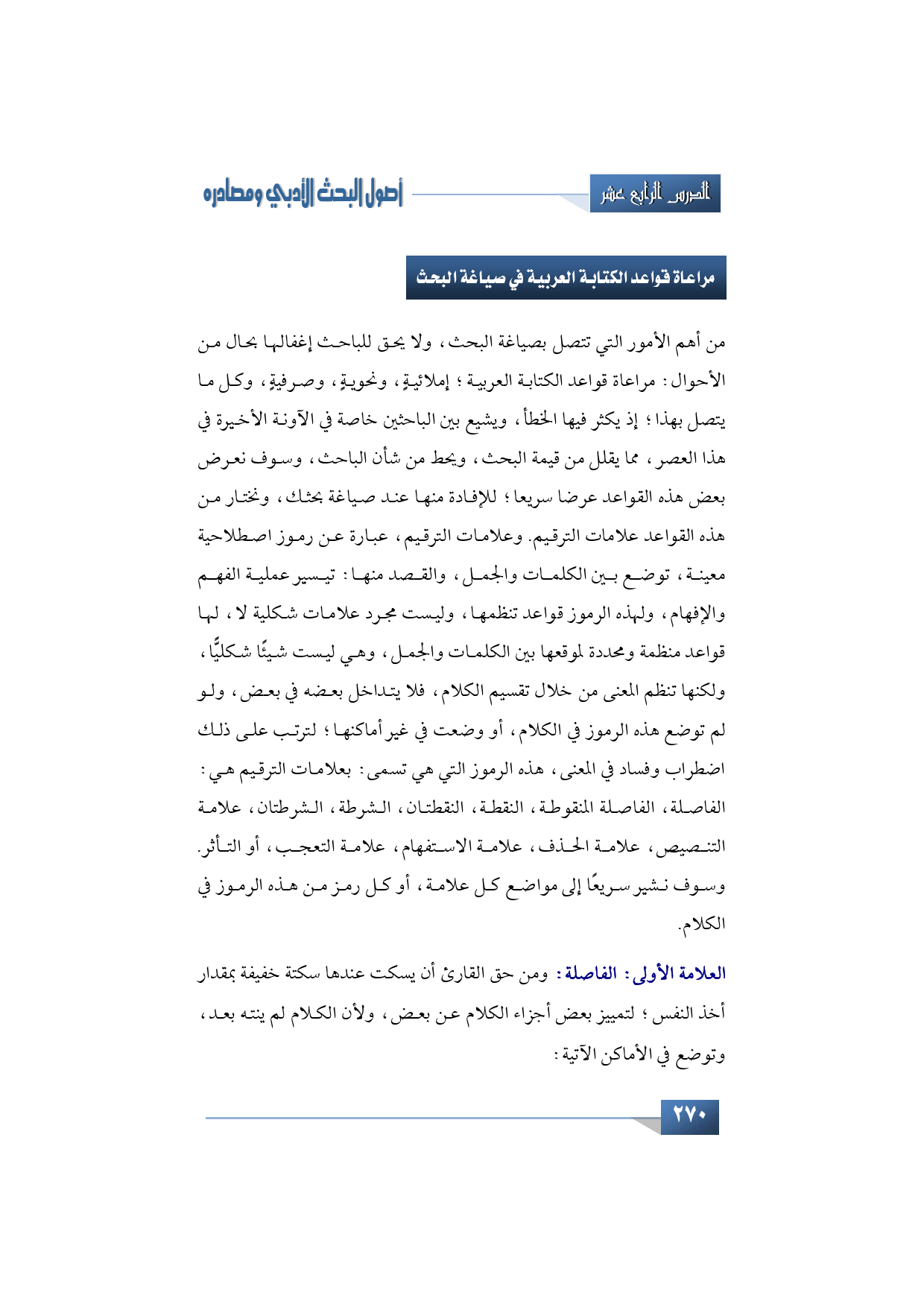 من أهم الأمور التي تتصل بصياغة البحث، ولا يحق للباحث إغفالها بحال من الأحوال: مراعاة قواعد الكتابة العربية؛ إملائية ٍ، ونحوية ٍ، وصرفية ٍ، وكل ما يتصل بهذا؛ إذ يكثر فيها الخطأ، ويشيع بين الباحثين خاصة في الآونة الأخيرة في هذا العصر، مما يقلل من قيمة البحث، ويحط من شأن الباحث، وسوف نعرض بعض هذه القواعد عرضا سريعا؛ للإفادة منها عند صياغة بحثك، ونختار من هذه القواعد علامات الترقيم. وعلامات الترقيم، عبارة عن رموز اصطلاحية معينة، توضع بين الكلمات والجمل، والقصد منها: تيسير عملية الفهم والإفهام، ولهذه الرموز قواعد تنظمها، وليست مجرد علامات شكلية لا، لها قواعد منظمة ومحددة لموقعها بين الكلمات والجمل، وهي ليست شيئًا شكليًّا، ولكنها تنظم المعنى من خلال تقسيم الكلام، فلا يتداخل بعضه في بعض، ولو لم توضع هذه الرموز في الكلام، أو وضعت في غير أماكنها؛ لترتب على ذلك اضطراب وفساد في المعنى، هذه الرموز التي هي تسمى: بعلامات الترقيم هي: الفاصلة، الفاصلة المنقوطة، النقطة، النقطتان، الشرطة، الشرطتان، علامة التنصيص، علامة الحذف، علامة الاستفهام، علامة التعجب، أو التأثر. وسوف نشير سريعًا إلى مواضع كل علامة، أو كل رمز من هذه الرموز في الكلام.