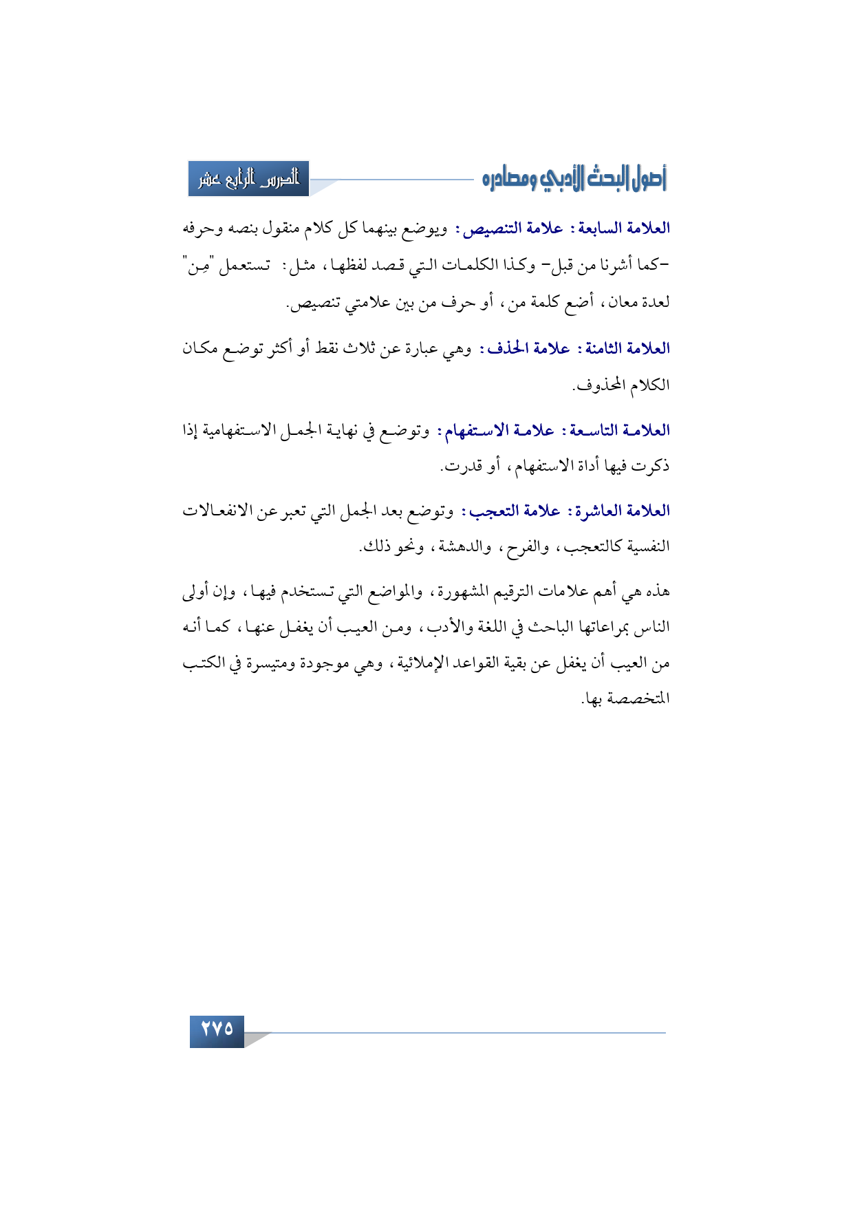 هذه هي أهم علامات الترقيم المشهورة، والمواضع التي تستخدم فيها، وإن أولى الناس بمراعاتها الباحث في اللغة والأدب، ومن العيب أن يغفل عنها، كما أنه من العيب أن يغفل عن بقية القواعد الإملائية، وهي موجودة ومتيسرة في الكتب المتخصصة بها، فعليك الرجوع إليها أيها الباحث، والإفادة منها.