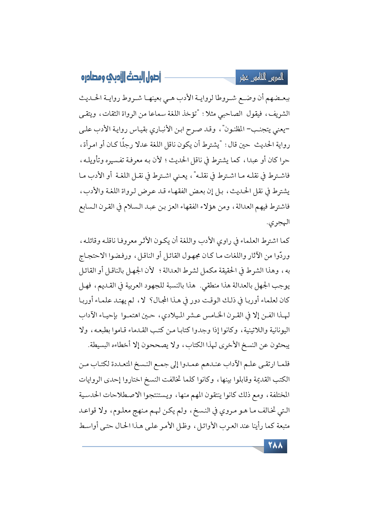 ببعضهم أن وضع شروطا لرواية الأدب هي بعينها شروط رواية الحديث الشريف، فيقول الصاحبي مثلا: "تؤخذ اللغة سماعا من الرواة الثقات، ويتقى -يعني يتجنب- المظنون"، وقد صرح ابن الأنباري بقياس رواية الأدب على رواية الحديث حين قال: "يشترط أن يكون ناقل اللغة عدلا رجلا كان أو امرأة، حرا كان أو عبدا، كما يشترط في ناقل الحديث؛ لأن به معرفة تفسيره وتأويله، فاشترط في نقله ما اشترط في نقله"، يعني اشترط في نقل اللغة أو الأدب ما يشترط في نقل الحديث، بل إن بعض الفقهاء قد عرض لرواة اللغة والأدب، فاشترط فيهم العدالة، ومن هؤلاء الفقهاء العز بن عبد السلام في القرن السابع الهجري.
