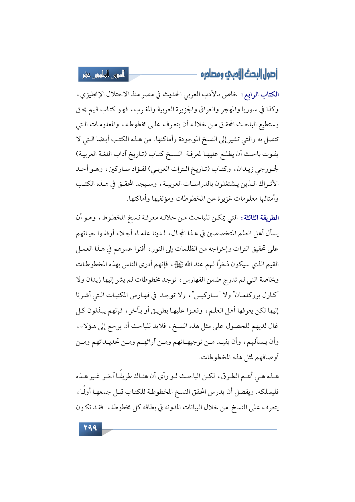 الكتاب الرابع: خاص بالأدب العربي الحديث في مصر منذ الاحتلال الإنجليزي، وكذا في سوريا والمهجر والعراق والجزيرة العربية والمغرب، فهو كتاب قيم بحق يستطيع الباحث المحقق من خلاله أن يتعرف على مخطوطه، والمعلومات التي تتصل به والتي تشير إلى النسخ الموجودة وأماكنها. من هذه الكتب أيضا التي لا يفوت باحث أن يطلع عليها لمعرفة النسخ كتاب (تاريخ آداب اللغة العربية) لجورجي زيدان، وكتاب (تاريخ التراث العربي) لفؤاد ساركين، وهو أحد الأتراك الذين يشتغلون بالدراسات العربية، وسيجد المحقق في هذه الكتب وأمثالها معلومات غزيرة عن المخطوطات ومؤلفيها وأماكنها.