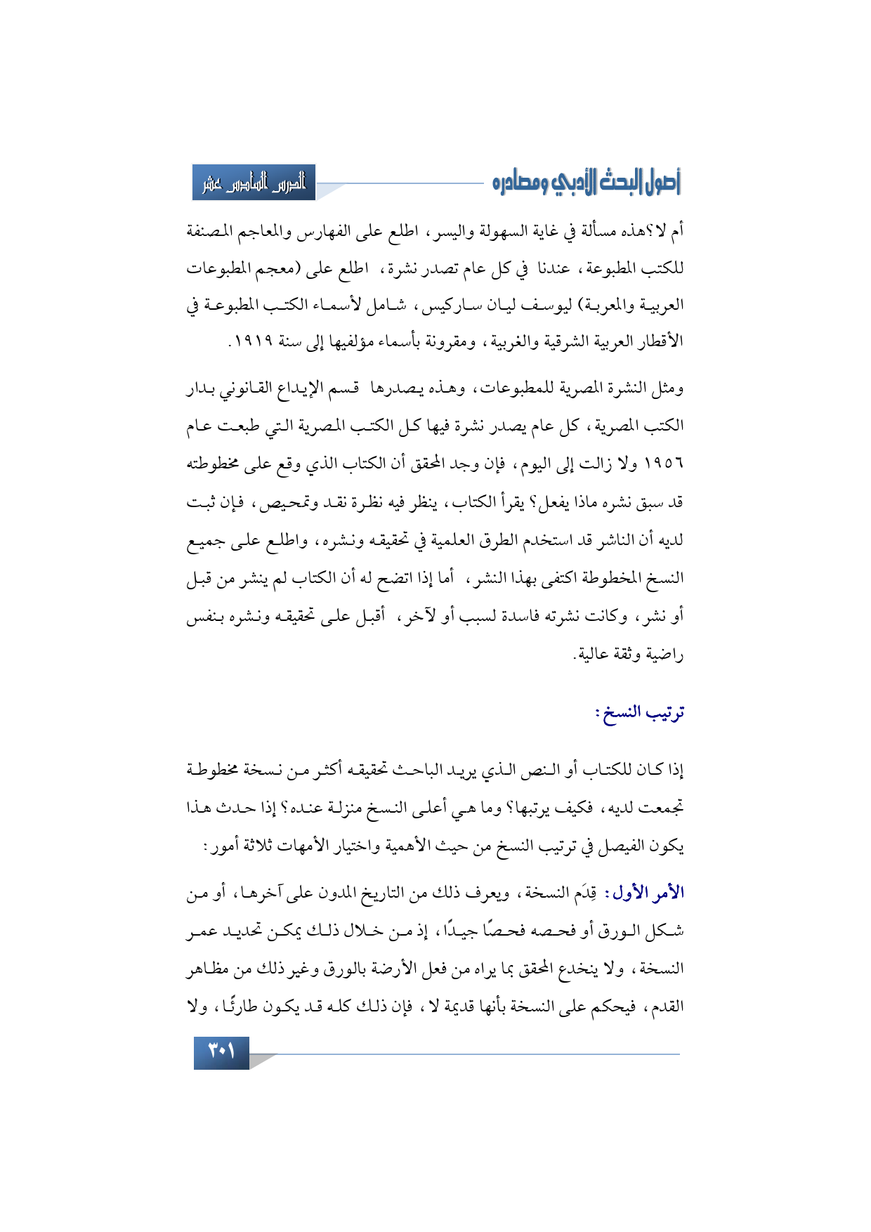 ترتيب النسخ: إذا كان للكتاب أو النص الذي يريد الباحث تحقيقه أكثر من نسخة مخطوطة تجمعت لديه، فكيف يرتبها؟ وما هي أعلى النسخ منزلة عنده؟ إذا حدث هذا يكون الفيصل في ترتيب النسخ من حيث الأهمية واختيار الأمهات ثلاثة أمور؛ أولا: قِدَم النسخة، ويعرف ذلك من التاريخ المدون على آخرها، أو من شكل الورق أو فحصه فحصا جيدا، إذ من خلال ذلك يمكن تحديد عمر النسخة، ولا ينخدع المحقق بما يراه من فعل الأرضة بالورق وغير ذلك من مظاهر القدم، فيحكم على النسخة بأنها قديمة لا، فإن ذلك كله قد يكون طارئا، ولا