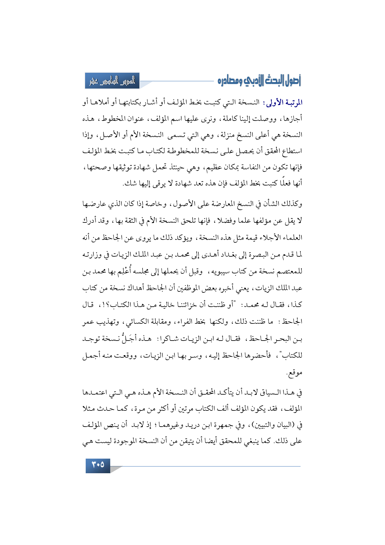 في هذا السياق لابد أن يتأكد المحقق أن النسخة الأم هذه هي التي اعتمدها المؤلف، فقد يكون المؤلف ألف الكتاب مرتين أو أكثر من مرة، كما حدث مثلا في (البيان والتبيين)، وفي جمهرة ابن دريد وغيرهما؛ إذ لابد أن ينص المؤلف على ذلك. كما ينبغي للمحقق أيضا أن يتيقن من أن النسخة الموجودة ليست هي