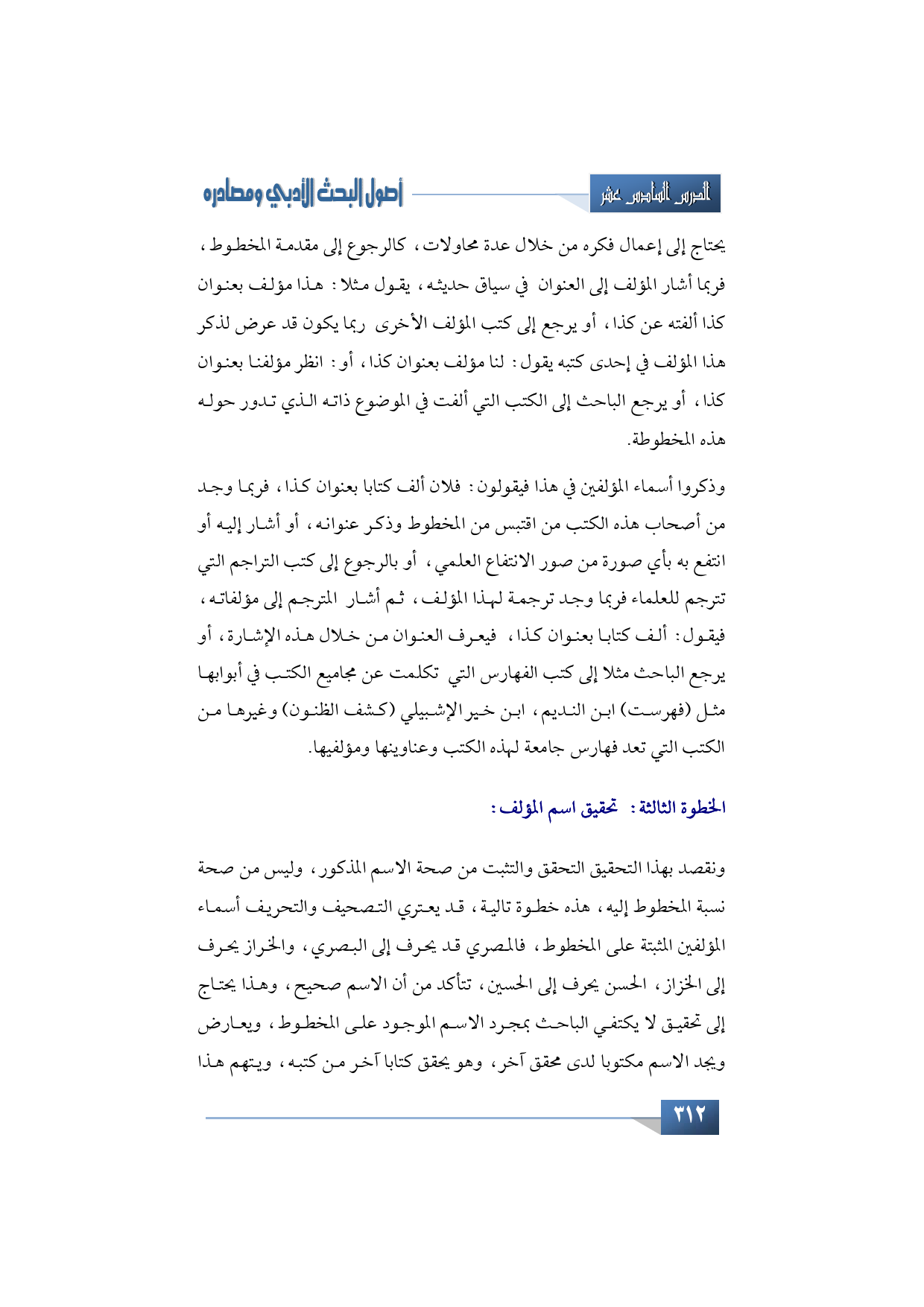 الخطوة الثالثة بعد تحقيق العنوان: تحقيق اسم المؤلف، وأقصد بهذا التحقيق التحقق والتثبت من صحة الاسم المذكور، وليس من صحة نسبة المخطوط إليه، هذه خطوة تالية، قد يعتري التصحيف والتحريف أسماء المؤلفين المثبتة على المخطوط، فالمصري قد يحرف إلى البصري، والخراز يحرف إلى الخزاز، الحسن يحرف إلى الحسين، تتأكد من أن الاسم صحيح، وهذا يحتاج إلى تحقيق لا يكتفي الباحث بمجرد الاسم الموجود على المخطوط، ويعارض ويجد الاسم مكتوبا لدى محقق آخر، وهو يحقق كتابا آخر من كتبه، ويتهم هذا