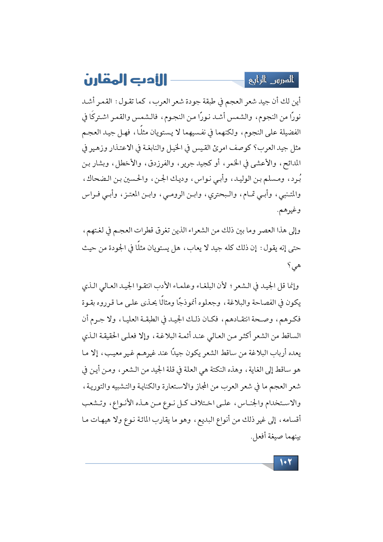 أين لك أن جيد شعر العجم في طبقة جودة شعر العرب، كما تقول: القمر أشد نورًا من النجوم، والشمس أشد نورًا من النجوم، فالشمس والقمر اشتركَا في الفضيلة على النجوم، ولكنهما في نفسيهما لا يستويان مثلًا، فهل جيد العجم مثل جيد العرب كوصف امرئ القيس في الخيل والنابغة في الاعتذار وزهير في المدائح، والأعشى في الخمر، أو كجيد جرير والفرزدق والأخطل وبشار بن بُرد ومسلم بن الوليد وأبي نواس، وديك الجن والحسين بن الضحاك والمتنبي وأبي تمام والبحتري وابن الرومي وابن المعتز وأبي فراس وغيرهم.