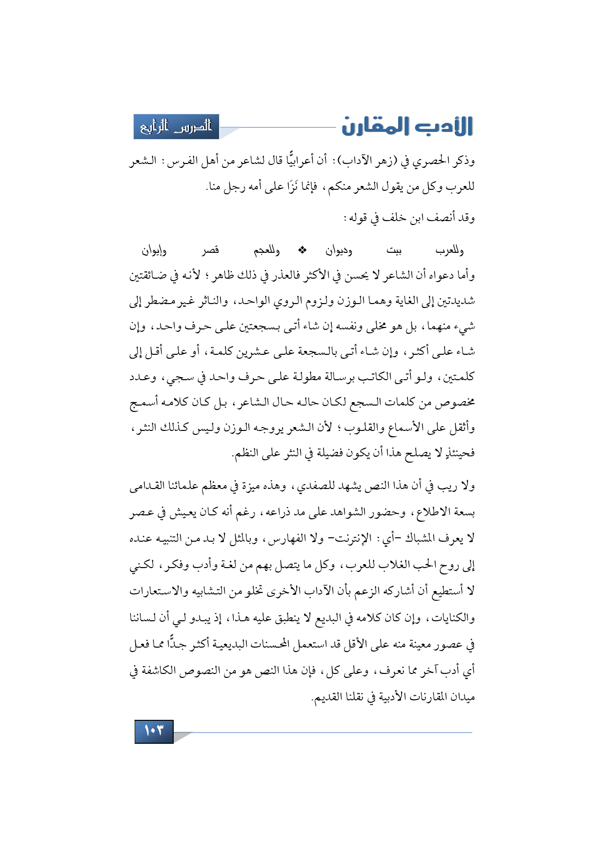 ولا ريب في أن هذا النص يشهد للصفدي، وهذه ميزة في معظم علمائنا القدامى بسعة الاطلاع، وحضور الشواهد على مد ذراعه، رغم أنه كان يعيش في عصر لا يعرف المشباك -أي: الإنترنت- ولا الفهارس، وبالمثل لا بد من التنبيه عنده إلى روح الحب الغلاب للعرب، وكل ما يتصل بهم من لغة وأدب وفكر، لكني لا أستطيع أن أشاركه الزعم بأن الآداب الأخرى تخلو من التشابيه والاستعارات والكنايات، وإن كان كلامه في البديع لا ينطبق عليه هذا، إذ يبدو لي أن لساننا في عصور معينة منه على الأقل قد استعمل المحسنات البديعية أكثر جدًّا مما فعل أي أدب آخر مما نعرف، وعلى كل، فإن هذا النص هو من النصوص الكاشفة في ميدان المقارنات الأدبية في نقلنا القديم.