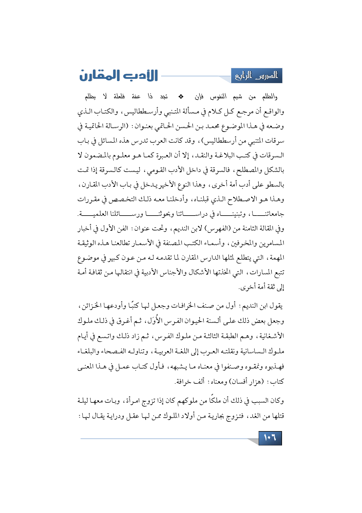 والواقع أن مرجع كل كلام في مسألة المتنبي وأرسططاليس، والكتاب الذي وضعه في هذا الموضوع محمد بن الحسن الحاتمي بعنوان: (الرسالة الحاتمية في سرقات المتنبي من أرسططاليس)، وقد كانت العرب تدرس هذه المسائل في باب السرقات في كتب البلاغة والنقد، إلا أن العبرة كما هو معلوم بالمضمون لا بالشكل والمصطلح، فالسرقة في داخل الأدب القومي ليست كالسرقة إذا تمت بالسطو على أدب أمة أخرى، وهذا النوع الأخير يدخل في باب الأدب المقارن، وهذا هو الاصطلاح الذي قبلناه، وأدخلنا معه ذلك التخصص في مقررات جامعاتنا، وتبنيناه في دراساتنا وبحوثنا ورسائلنا العلمية.