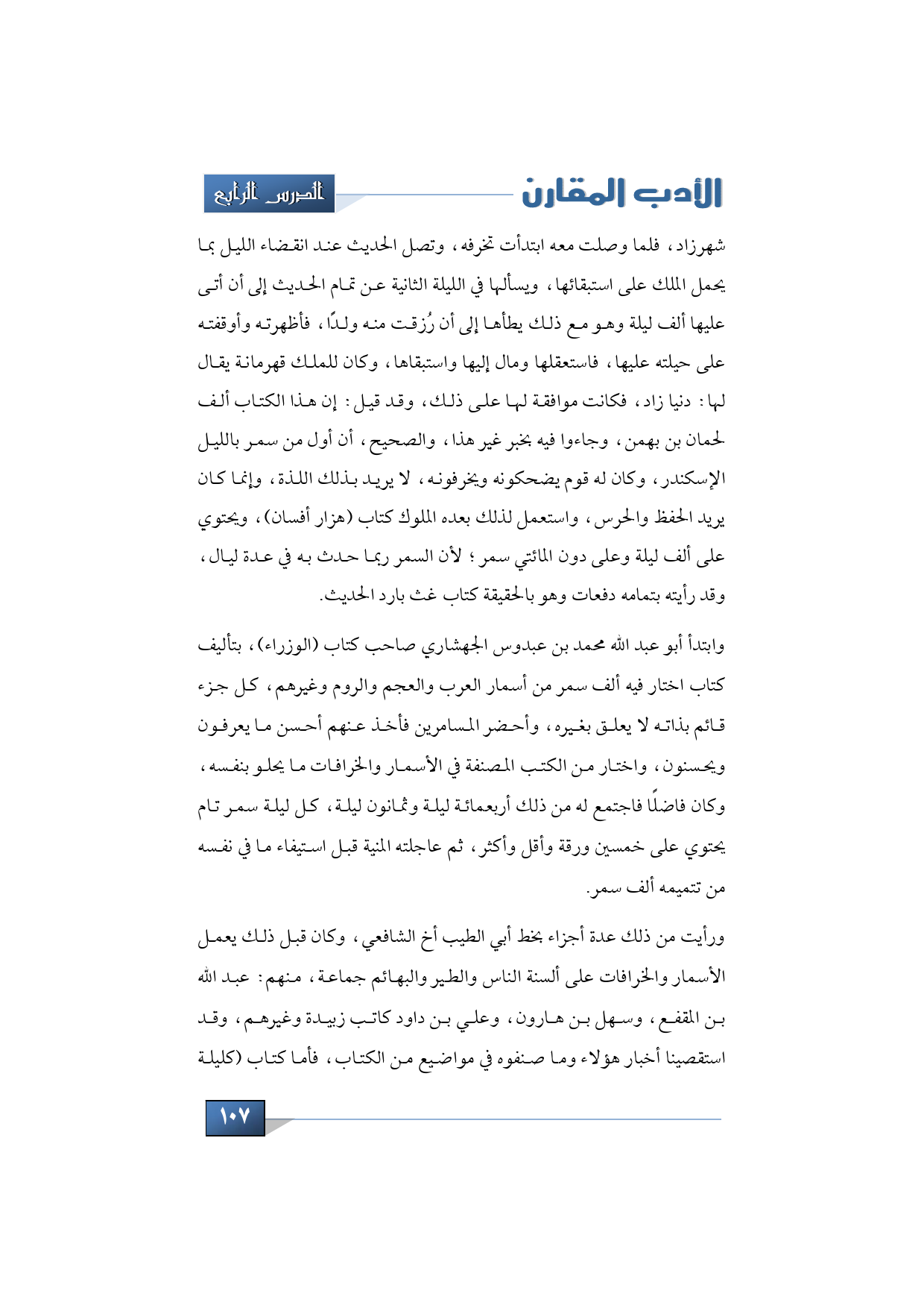 شهرزاد فلما حصلت معه ابتدأت تخرفه، وتصل الحديث عند انقضاء الليل بما يحمل الملك على استبقائها، ويسألها في الليلة الثانية عن تمام الحديث إلى أن أتى عليها ألف ليلة وهو مع ذلك يطأها إلى أن رُزقت منه ولدًا، فأظهرته وأوقفته على حيلته عليها، فاستعقلها ومال إليها واستبقاها، وكان للملك قهرمانة يقال لها: دنيا زاد، فكانت موافقة لها على ذلك، وقد قيل: إن هذا الكتاب ألف لحمان بن بهمن وجاءوا فيه بخبر غير هذا، والصحيح إن شاء الله أن أول من سمر بالليل الإسكندر، وكان له قوم يضحكونه ويخرفونه لا يريد بذلك اللذة، وإنما كان يريد الحفظ والحرس، واستعمل لذلك بعده الملوك كتاب (هزار أفسان)، ويحتوي على ألف ليلة وعلى دون المائتي سمر؛ لأن السمر ربما حدث به في عدة ليال، وقد رأيته بتمامه دفعات وهو بالحقيقة كتاب غث بارد الحديث.