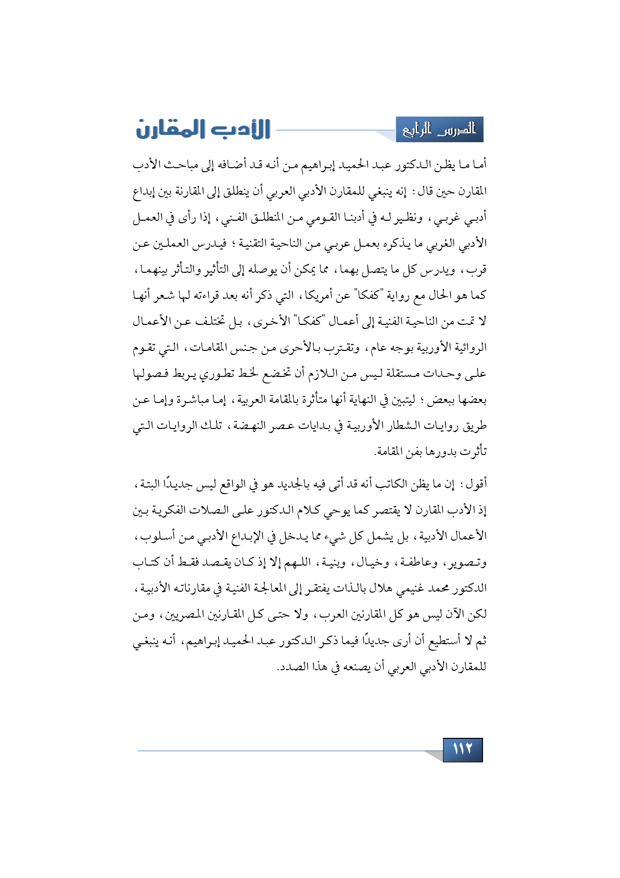 أقول: إن ما يظن الكاتب أنه قد أتى فيه بالجديد هو في الواقع ليس جديدًا البتة، إذ الأدب المقارن لا يقتصر كما يوحي كلام الدكتور على الصلات الفكرية بين الأعمال الأدبية، بل يشمل كل شيء مما يدخل في الإبداع الأدبي من أسلوب وتصوير وعاطفة وخيال وبِنية، اللهم إلا إذ كان يقصد فقط أن كتاب الدكتور محمد غنيمي هلال بالذات يفتقر إلى المعالجة الفنية في مقارناته الأدبية، لكن الآن ليس هو كل المقارنين العرب، ولا حتى كل المقارنين المصريين، ومن ثم لا أستطيع أن أرى جديدًا فيما ذكر الدكتور عبد الحميد إبراهيم أنه ينبغي للمقارن الأدبي العربي أن يصنعه في هذا الصدد.