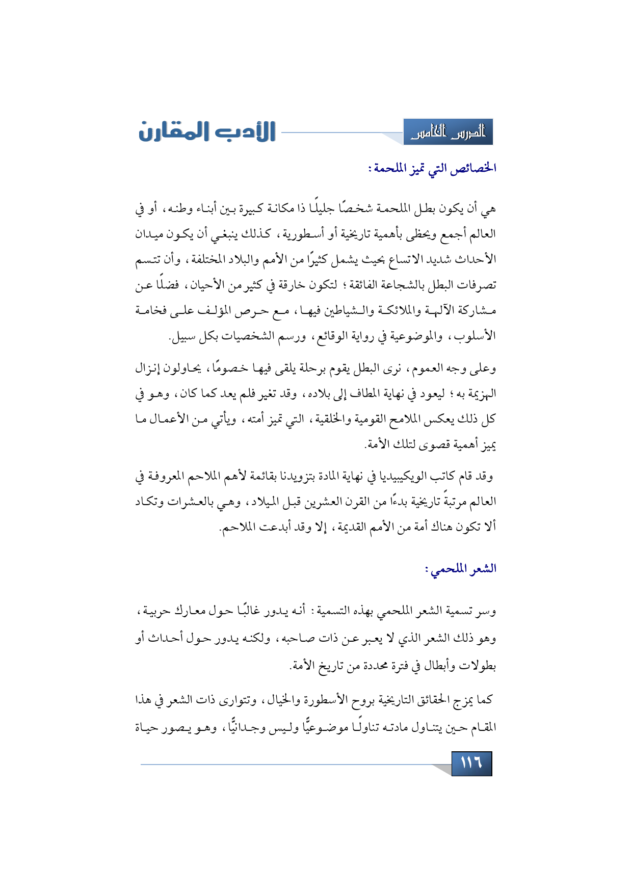 ويمضي كاتب المادة مسجلًا الخصائص التي تميز الملحمة عن غيرها من الإبداعات الأدبية، وهي أن يكون بطل الملحمة شخصًا جليلًا ذا مكانة كبيرة بين أبناء وطنه، أو في العالم أجمع ويحظى بأهمية تاريخية أو أسطورية، كذلك ينبغي أن يكون ميدان الأحداث شديد الاتساع بحيث يشمل كثيرًا من الأمم والبلاد المختلفة، وأن تتسم تصرفات البطل بالشجاعة الفائقة؛ حتى لتكون خارقة في كثير من الأحيان، فضلًا عن مشاركة الآلهة والملائكة والشياطين فيها، مع حرص المؤلف على فخامة الأسلوب، والموضوعية في رواية الوقائع، ورسم الشخصيات بكل سبيل.